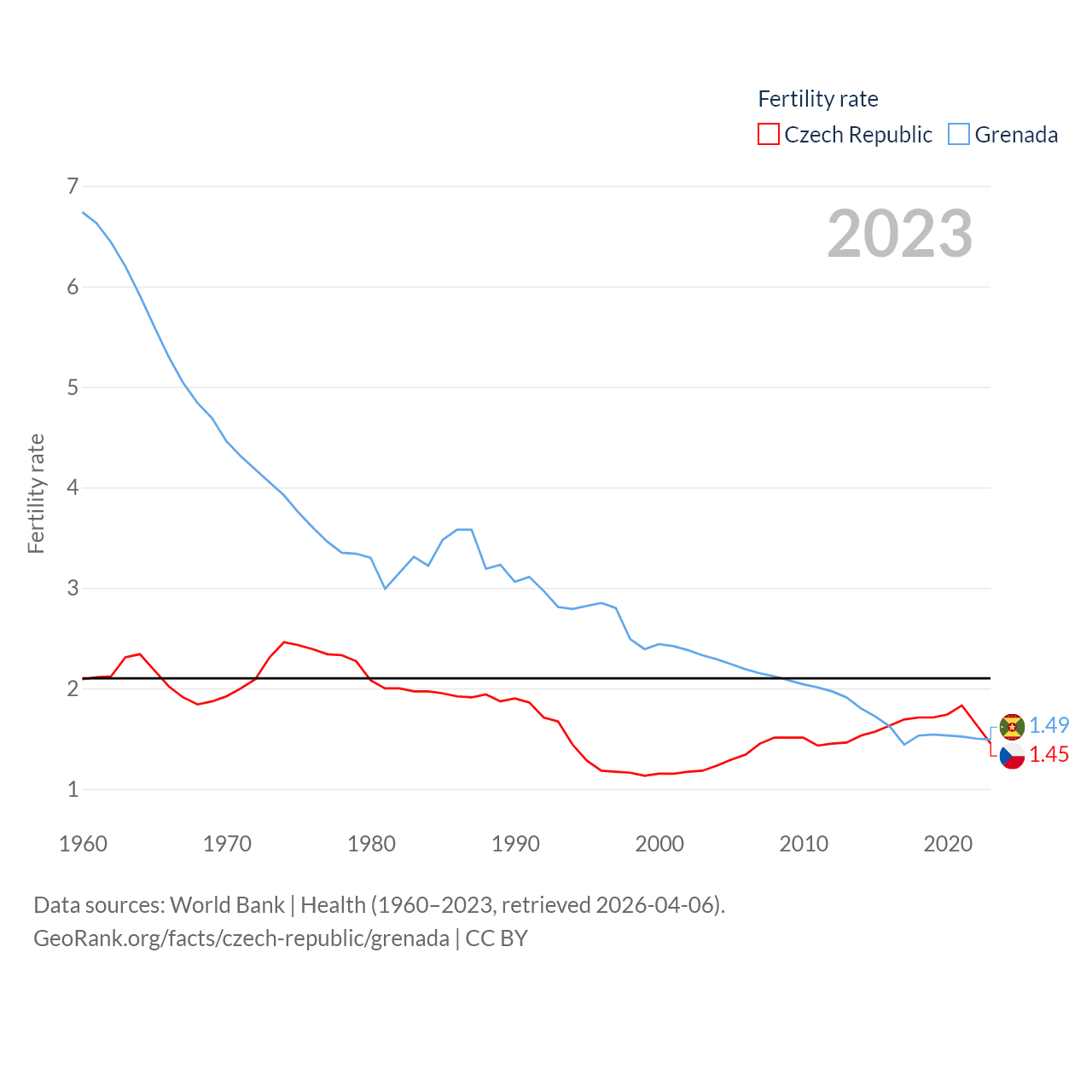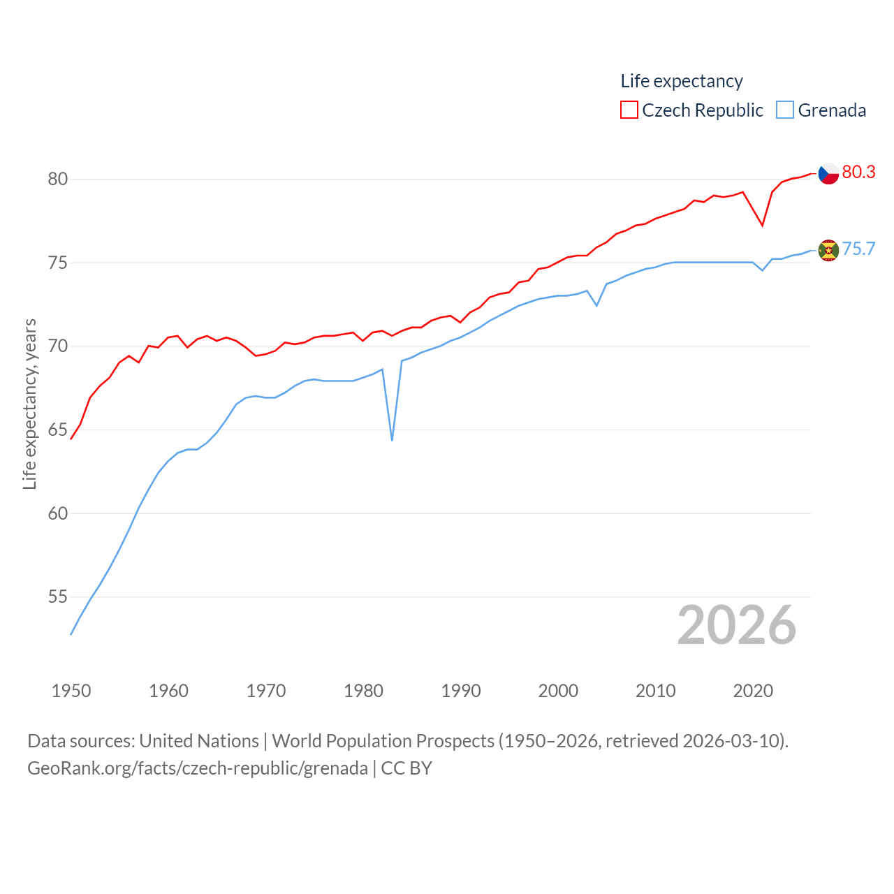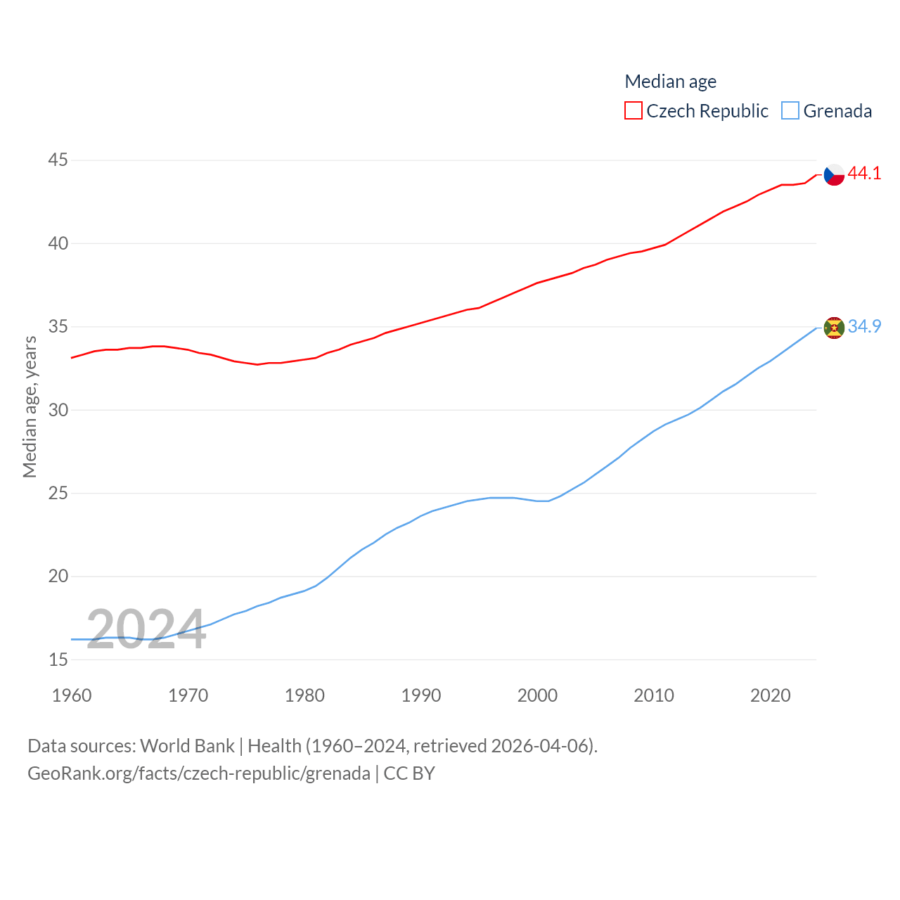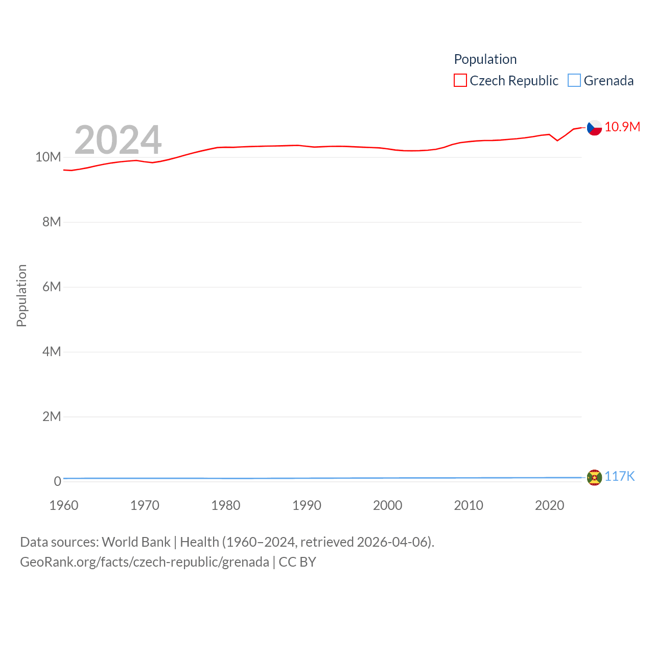 The Czech Republic has a population of 10.9M (ranked 88/197), compared with 117K in Grenada (ranked 182/197). The Czech Republic's land area is 29,794 sq mi versus 131.3 sq mi for Grenada (ranked 114th vs. 186th).