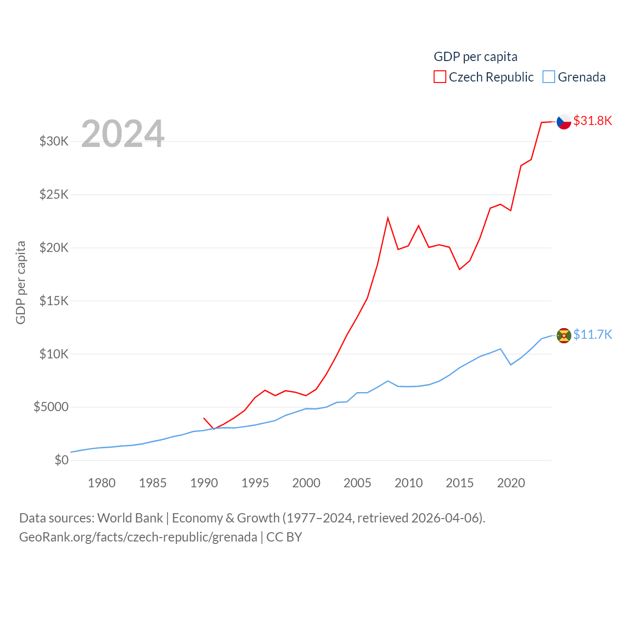 By GDP, The Czech Republic ranks 44/197 ($347B) and Grenada ranks 184/197 ($1.37B). By GDP per capita, The Czech Republic ranks 39/197 ($31,823), while Grenada ranks 80/197 ($11,705).