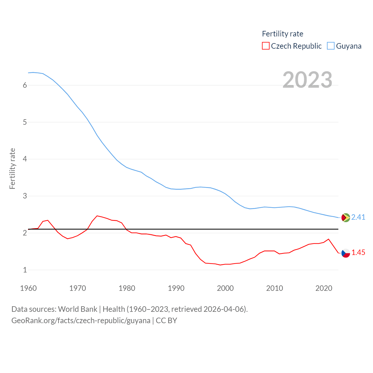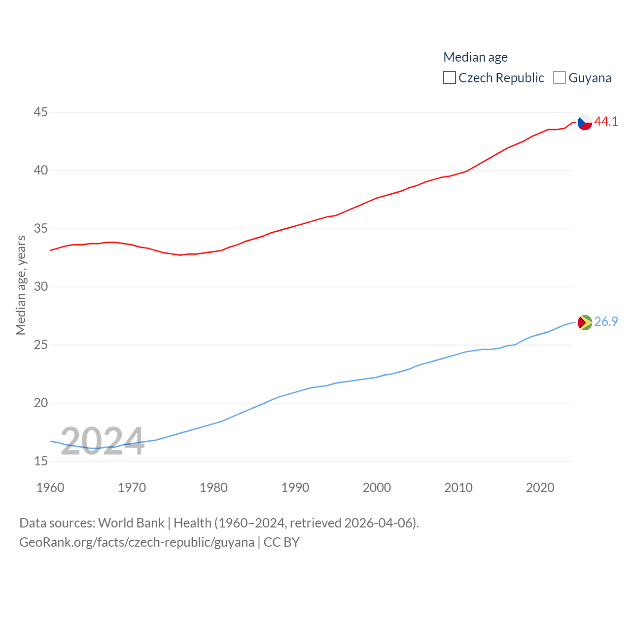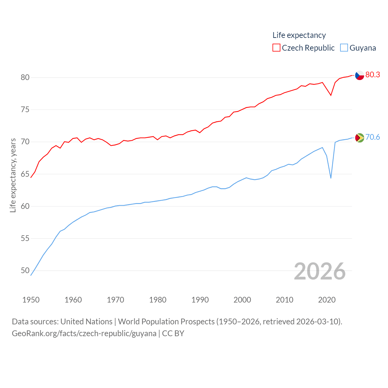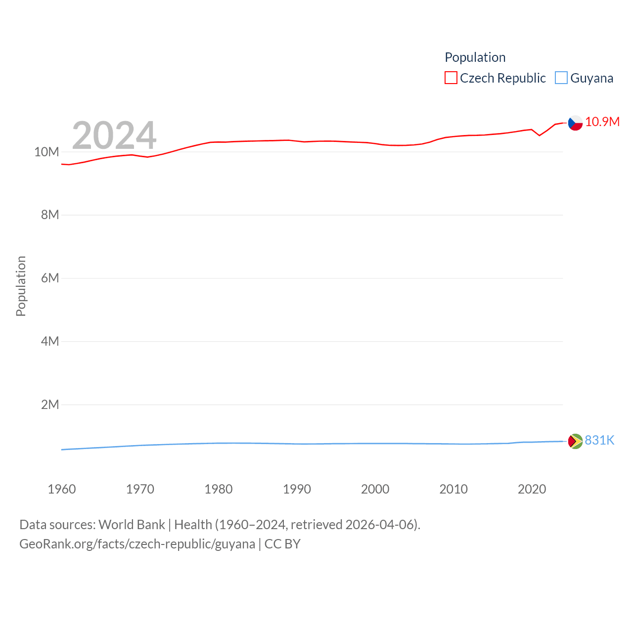 The Czech Republic has a population of 10.9M (ranked 88/197), compared with 831K in Guyana (ranked 161/197). The Czech Republic's land area is 29,794 sq mi versus 81,522 sq mi for Guyana (ranked 114th vs. 82nd).