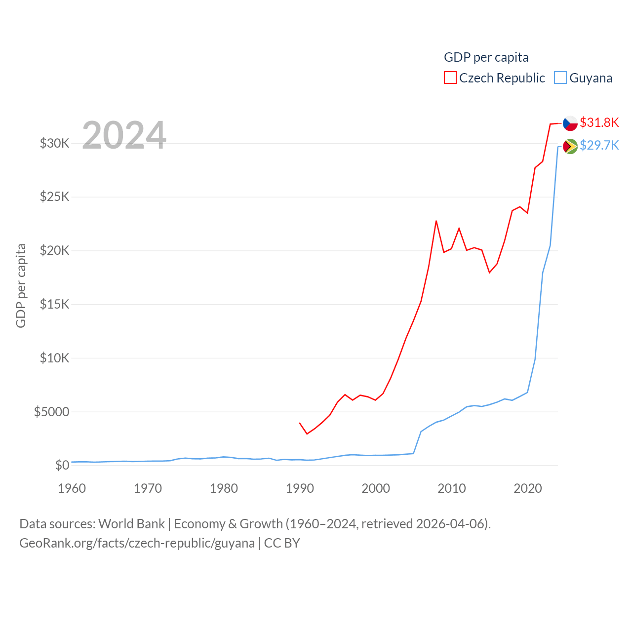 By GDP, The Czech Republic ranks 44/197 ($347B) and Guyana ranks 120/197 ($24.7B). By GDP per capita, The Czech Republic ranks 39/197 ($31,823), while Guyana ranks 41/197 ($29,675).