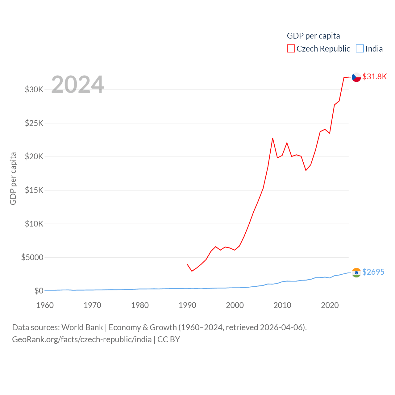 By GDP, The Czech Republic ranks 44/197 ($347B) and India ranks 5/197 ($3.91T). By GDP per capita, The Czech Republic ranks 39/197 ($31,823), while India ranks 143/197 ($2,695).