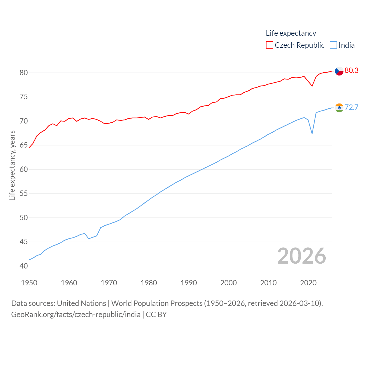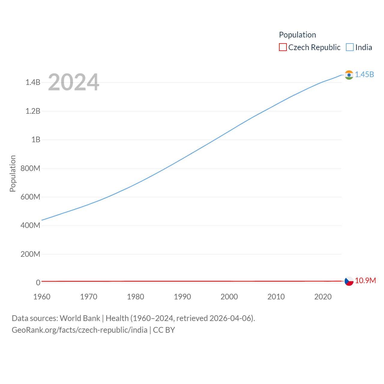 The Czech Republic has a population of 10.9M (ranked 88/197), compared with 1.45B in India (ranked 1/197). The Czech Republic's land area is 29,794 sq mi versus 1,147,955 sq mi for India (ranked 114th vs. 7th).