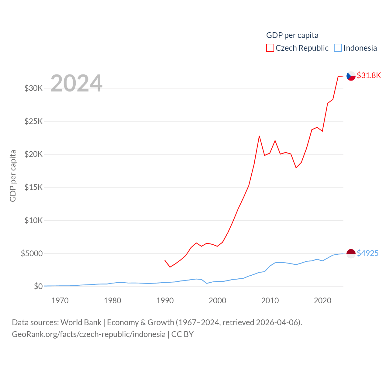 By GDP, The Czech Republic ranks 44/197 ($347B) and Indonesia ranks 16/197 ($1.4T). By GDP per capita, The Czech Republic ranks 39/197 ($31,823), while Indonesia ranks 121/197 ($4,925).