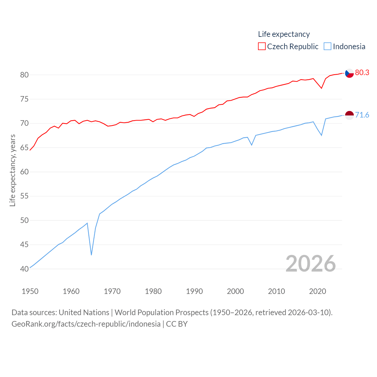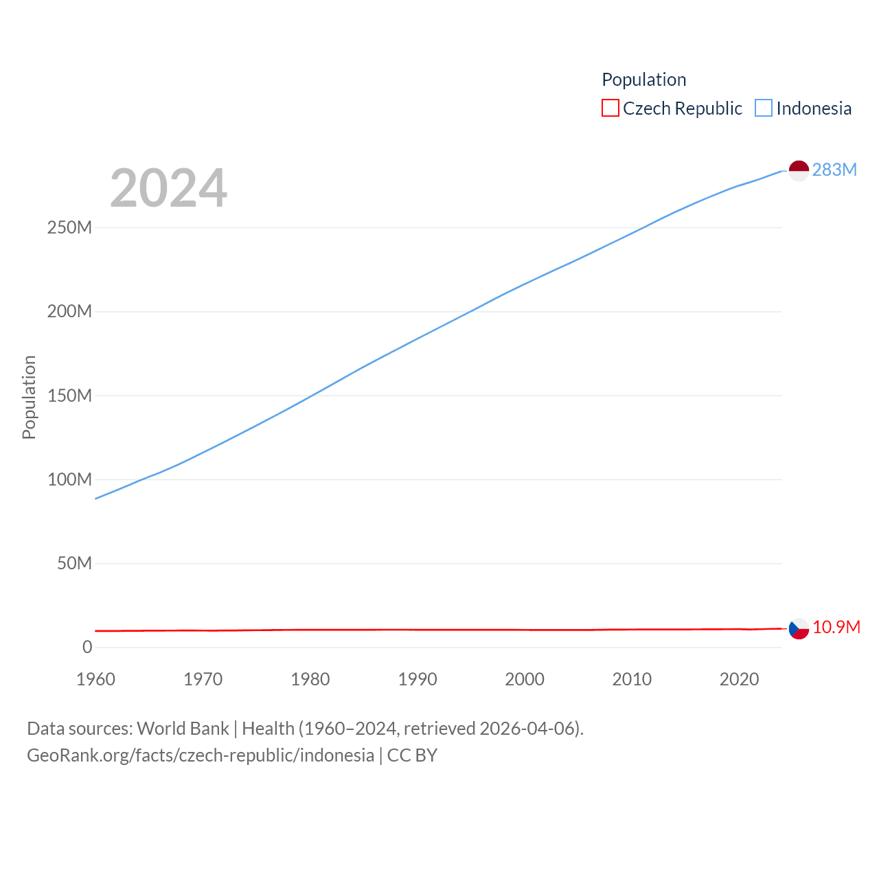 The Czech Republic has a population of 10.9M (ranked 88/197), compared with 283M in Indonesia (ranked 4/197). The Czech Republic's land area is 29,794 sq mi versus 730,720 sq mi for Indonesia (ranked 114th vs. 14th).