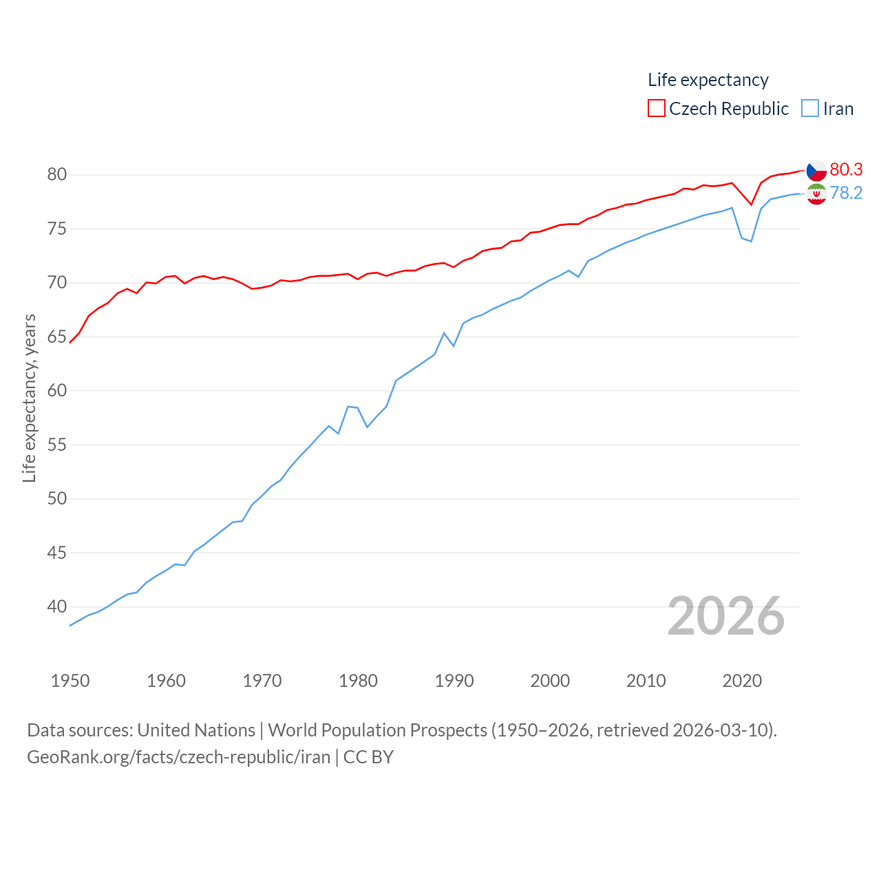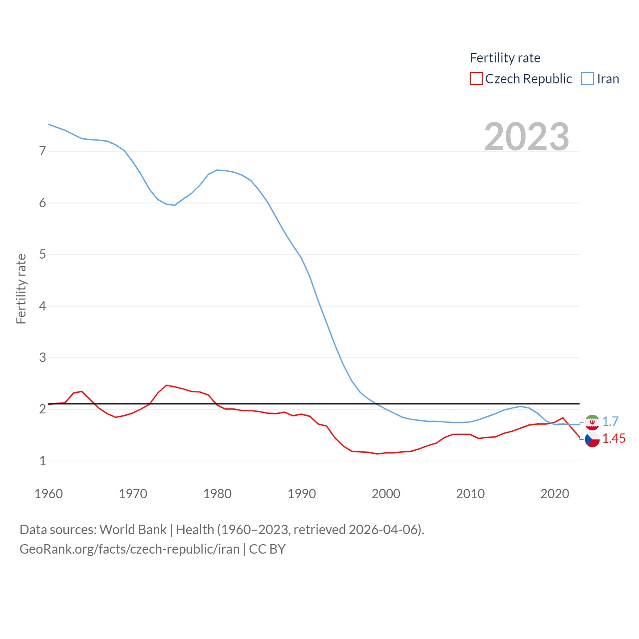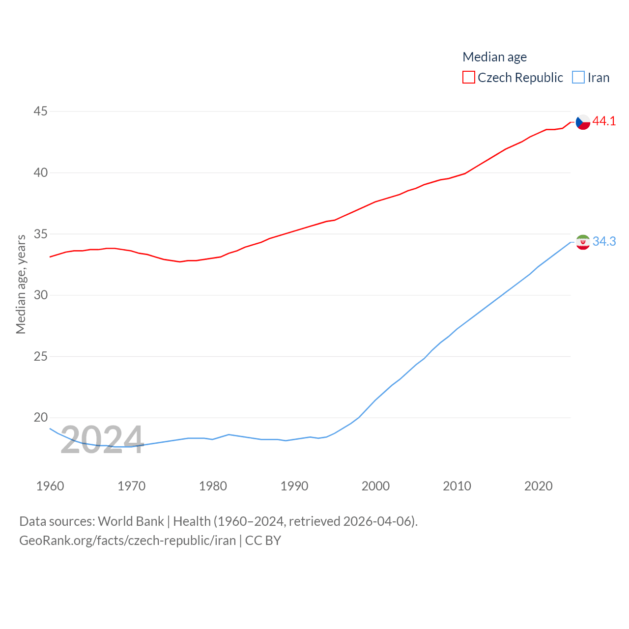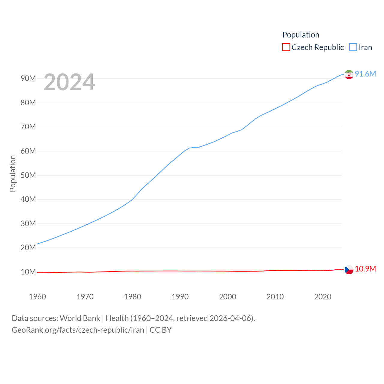 The Czech Republic has a population of 10.9M (ranked 88/197), compared with 91.6M in Iran (ranked 17/197). The Czech Republic's land area is 29,794 sq mi versus 626,451 sq mi for Iran (ranked 114th vs. 17th).