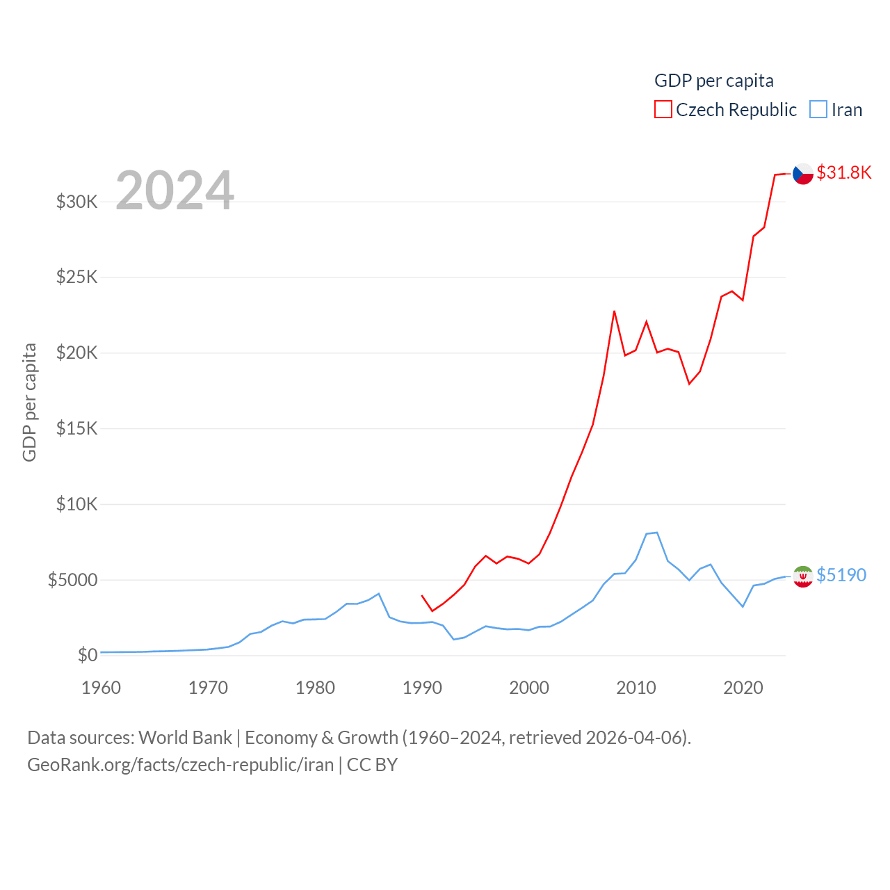By GDP, The Czech Republic ranks 44/197 ($347B) and Iran ranks 34/197 ($475B). By GDP per capita, The Czech Republic ranks 39/197 ($31,823), while Iran ranks 119/197 ($5,190).