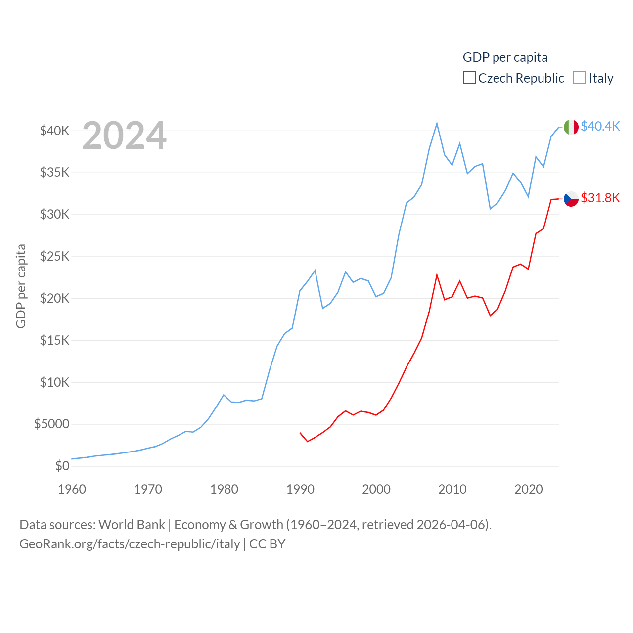 By GDP, The Czech Republic ranks 44/197 ($347B) and Italy ranks 8/197 ($2.38T). By GDP per capita, The Czech Republic ranks 39/197 ($31,823), while Italy ranks 29/197 ($40,385).