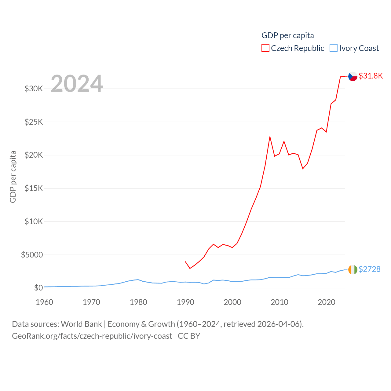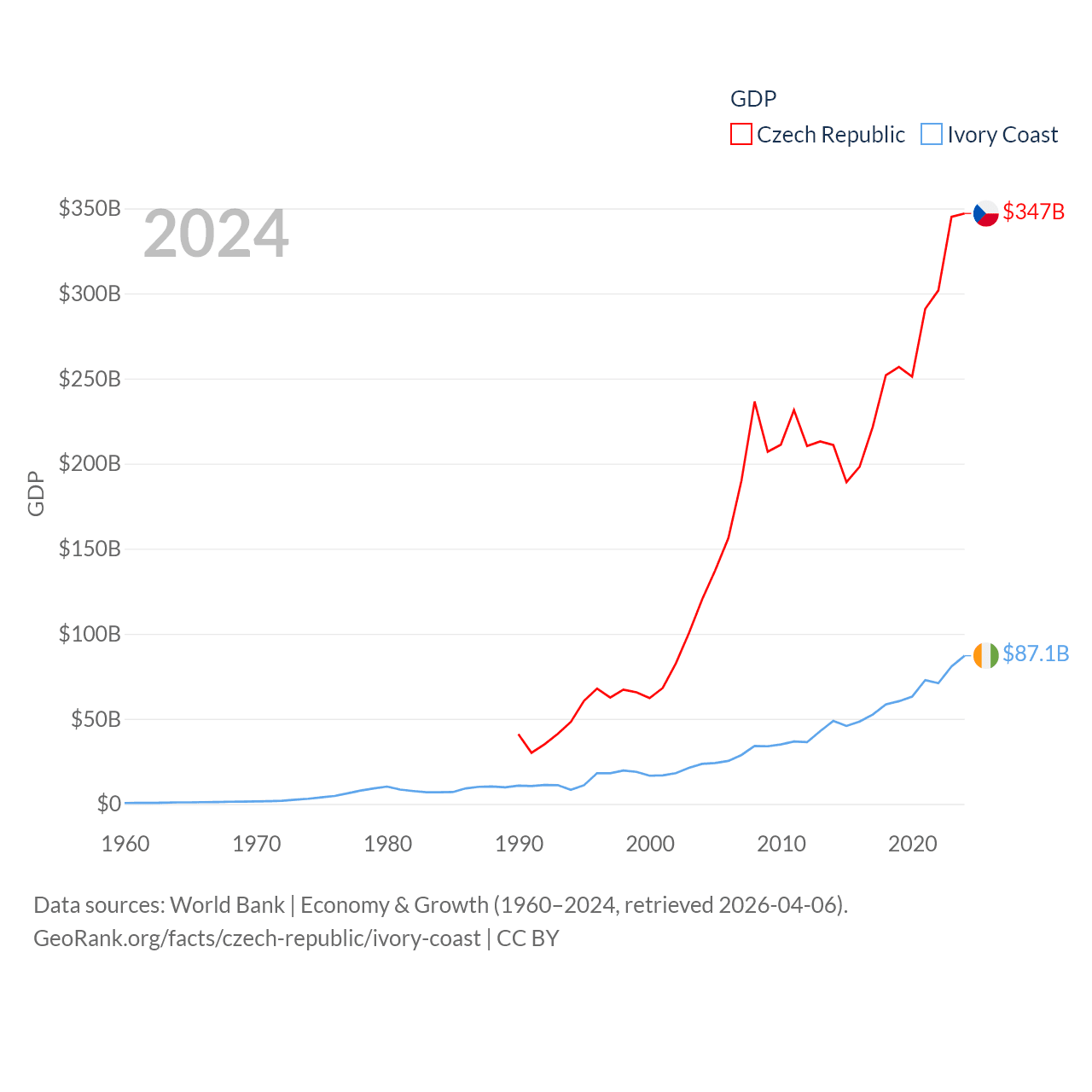 By GDP, The Czech Republic ranks 44/197 ($347B) and Ivory Coast ranks 77/197 ($87.1B). By GDP per capita, The Czech Republic ranks 39/197 ($31,823), while Ivory Coast ranks 142/197 ($2,728).