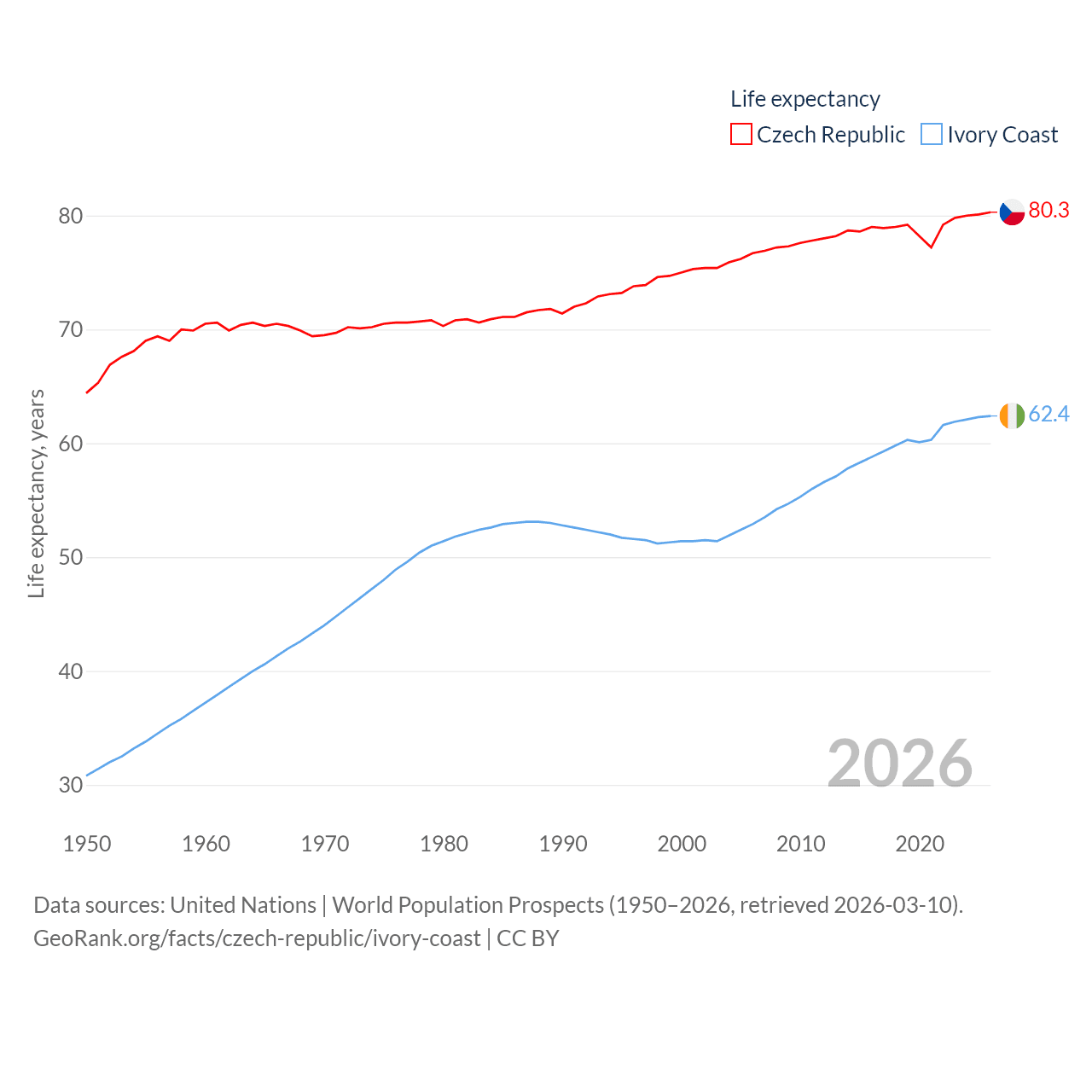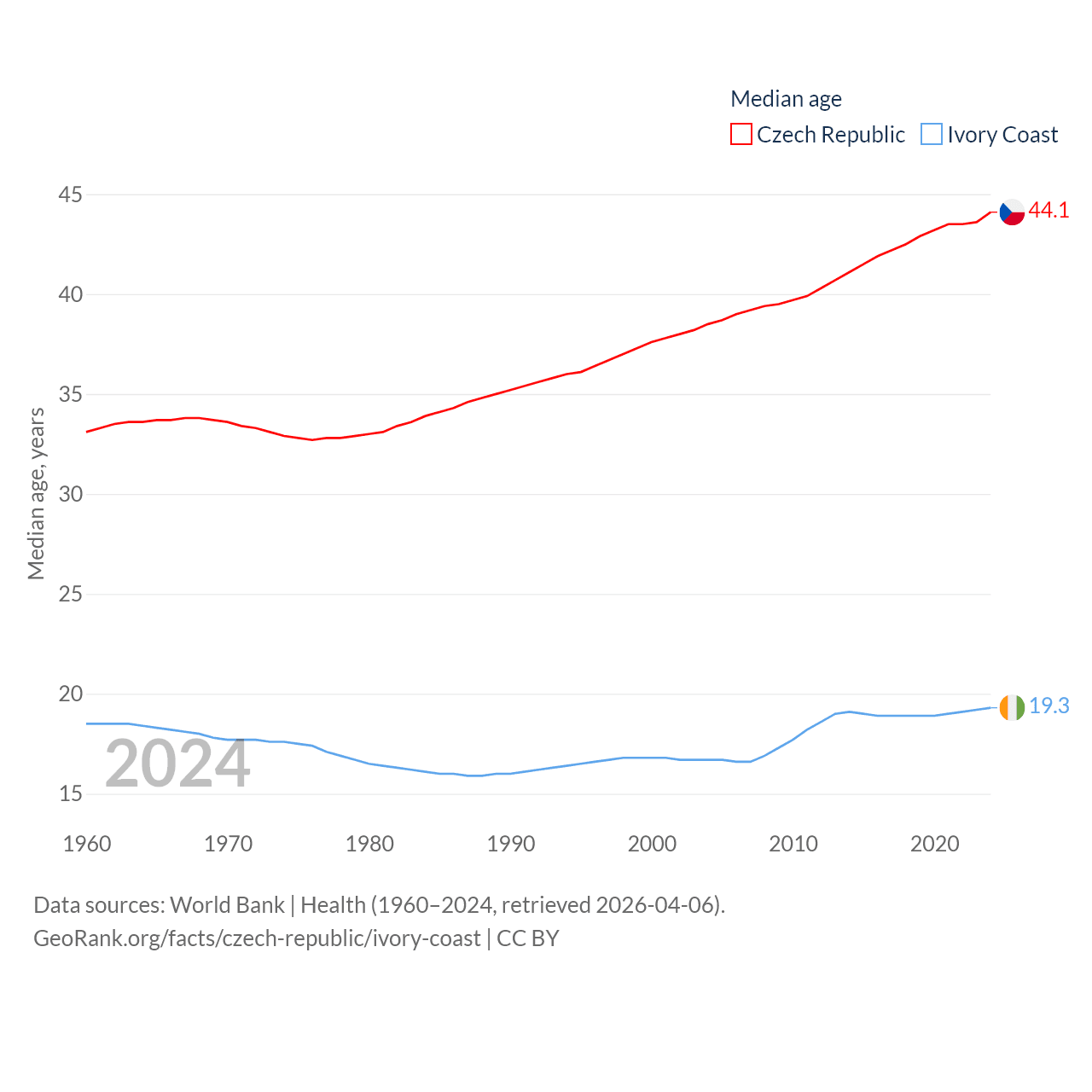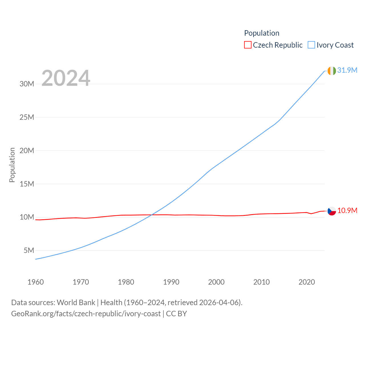 The Czech Republic has a population of 10.9M (ranked 88/197), compared with 31.9M in Ivory Coast (ranked 50/197). The Czech Republic's land area is 29,794 sq mi versus 122,780 sq mi for Ivory Coast (ranked 114th vs. 66th).