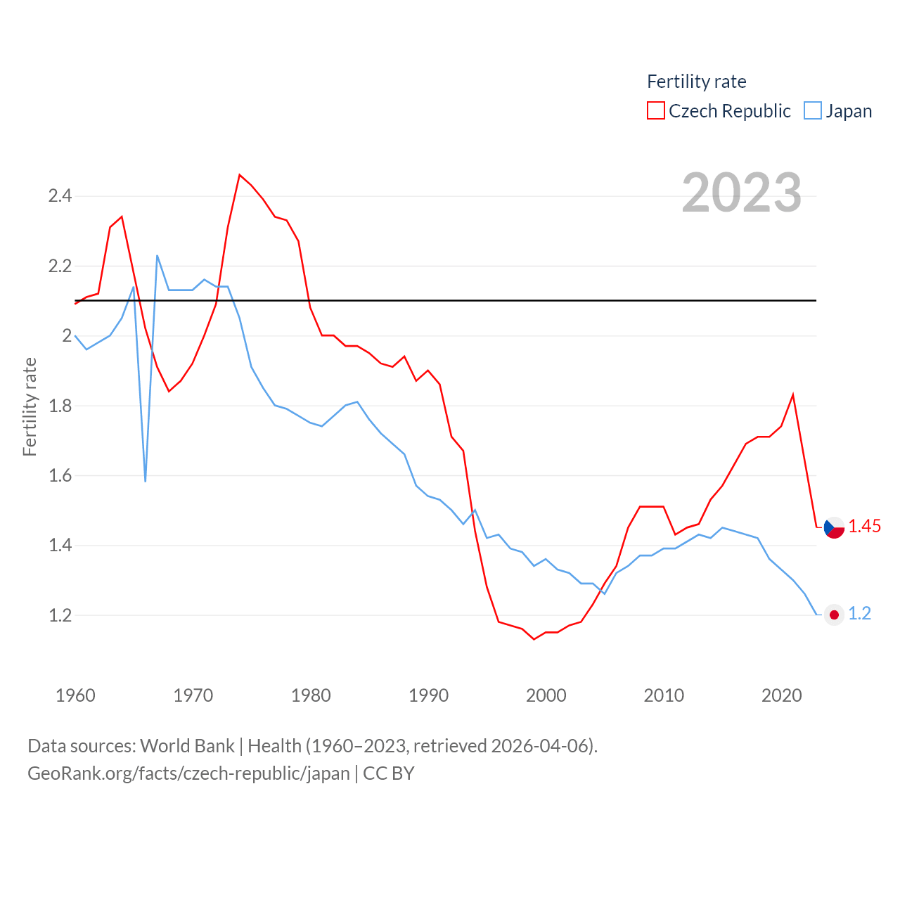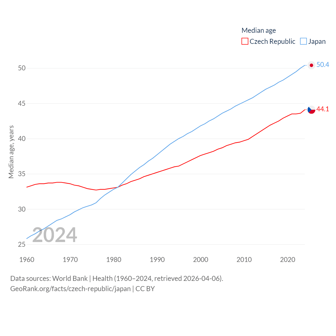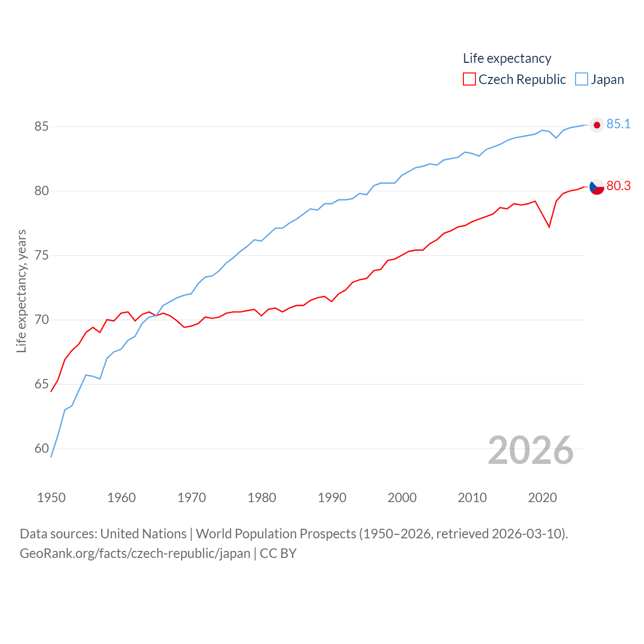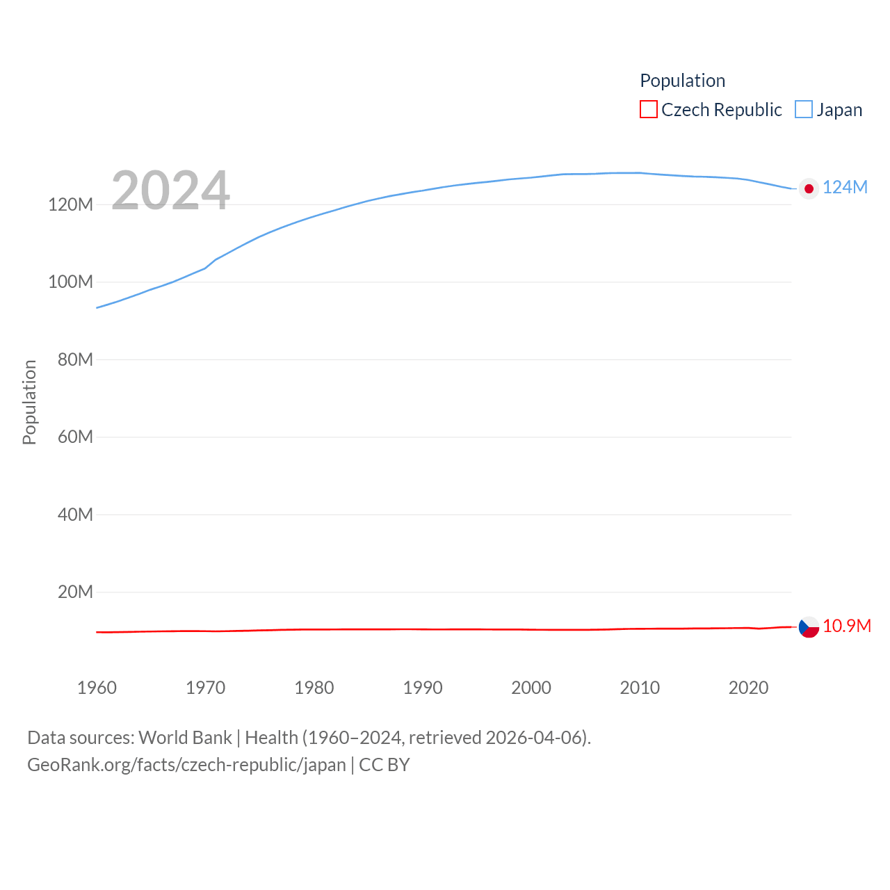 The Czech Republic has a population of 10.9M (ranked 88/197), compared with 124M in Japan (ranked 12/197). The Czech Republic's land area is 29,794 sq mi versus 140,761 sq mi for Japan (ranked 114th vs. 61st).