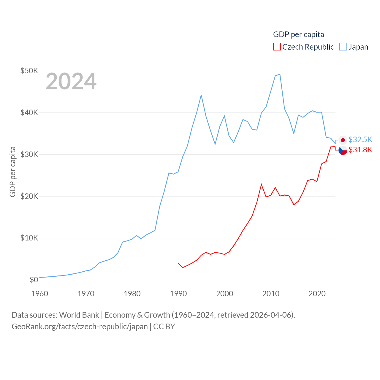 By GDP, The Czech Republic ranks 44/197 ($347B) and Japan ranks 4/197 ($4.03T). By GDP per capita, The Czech Republic ranks 39/197 ($31,823), while Japan ranks 38/197 ($32,487).