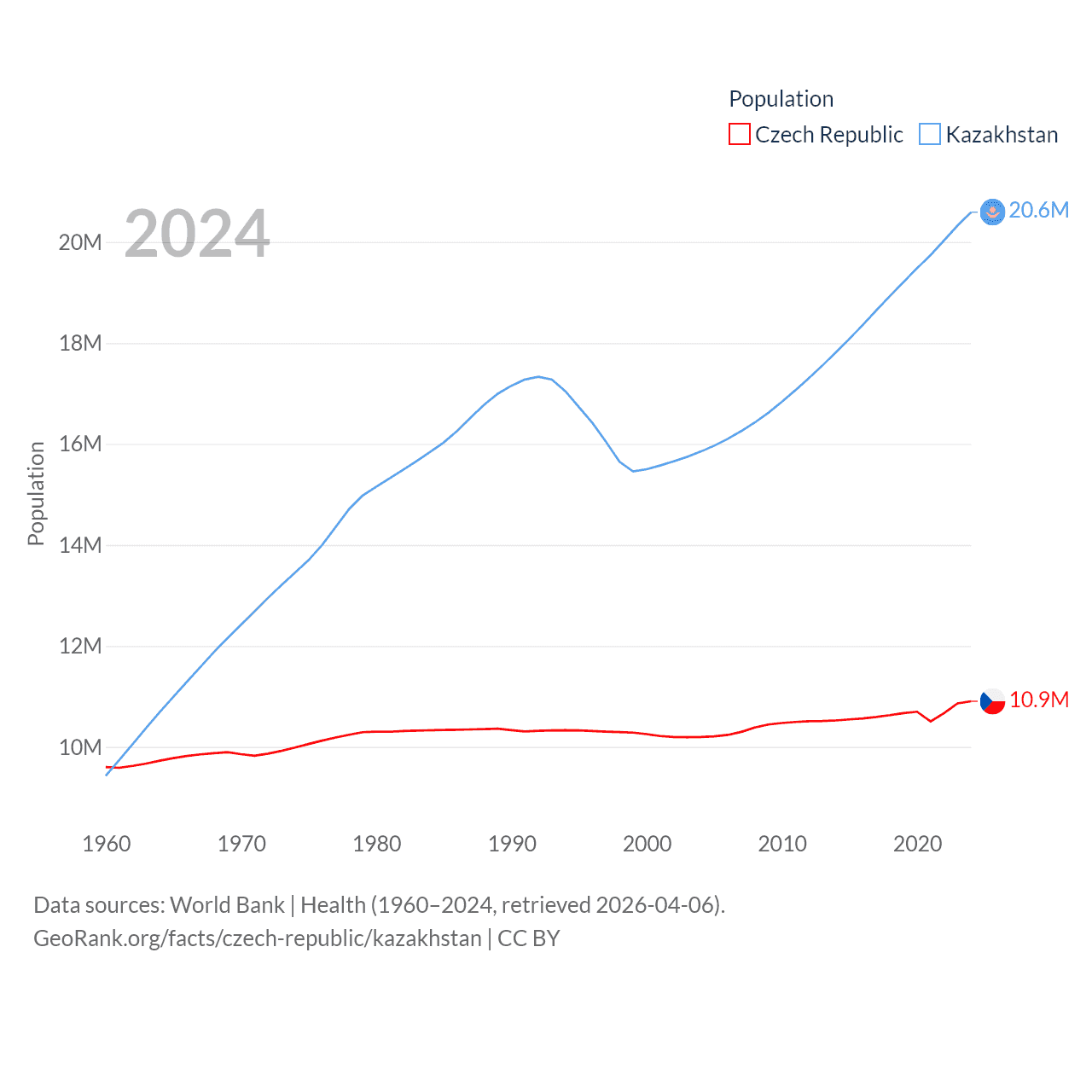 The Czech Republic has a population of 10.9M (ranked 88/197), compared with 20.6M in Kazakhstan (ranked 64/197). The Czech Republic's land area is 29,794 sq mi versus 1,042,360 sq mi for Kazakhstan (ranked 114th vs. 9th).