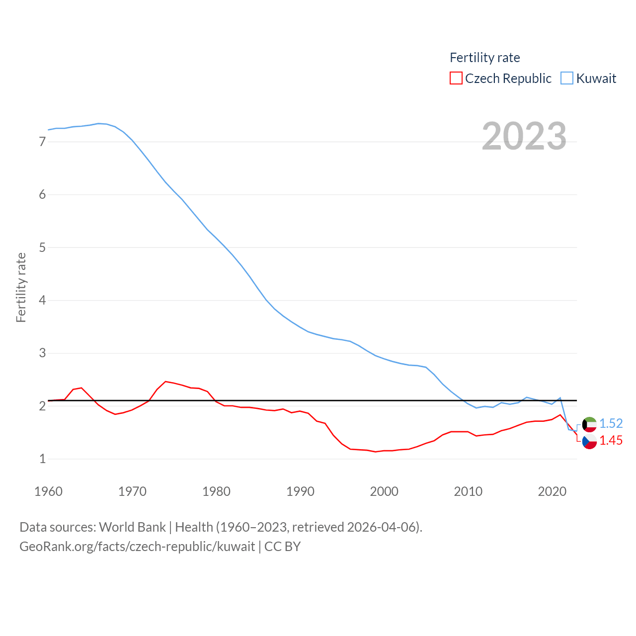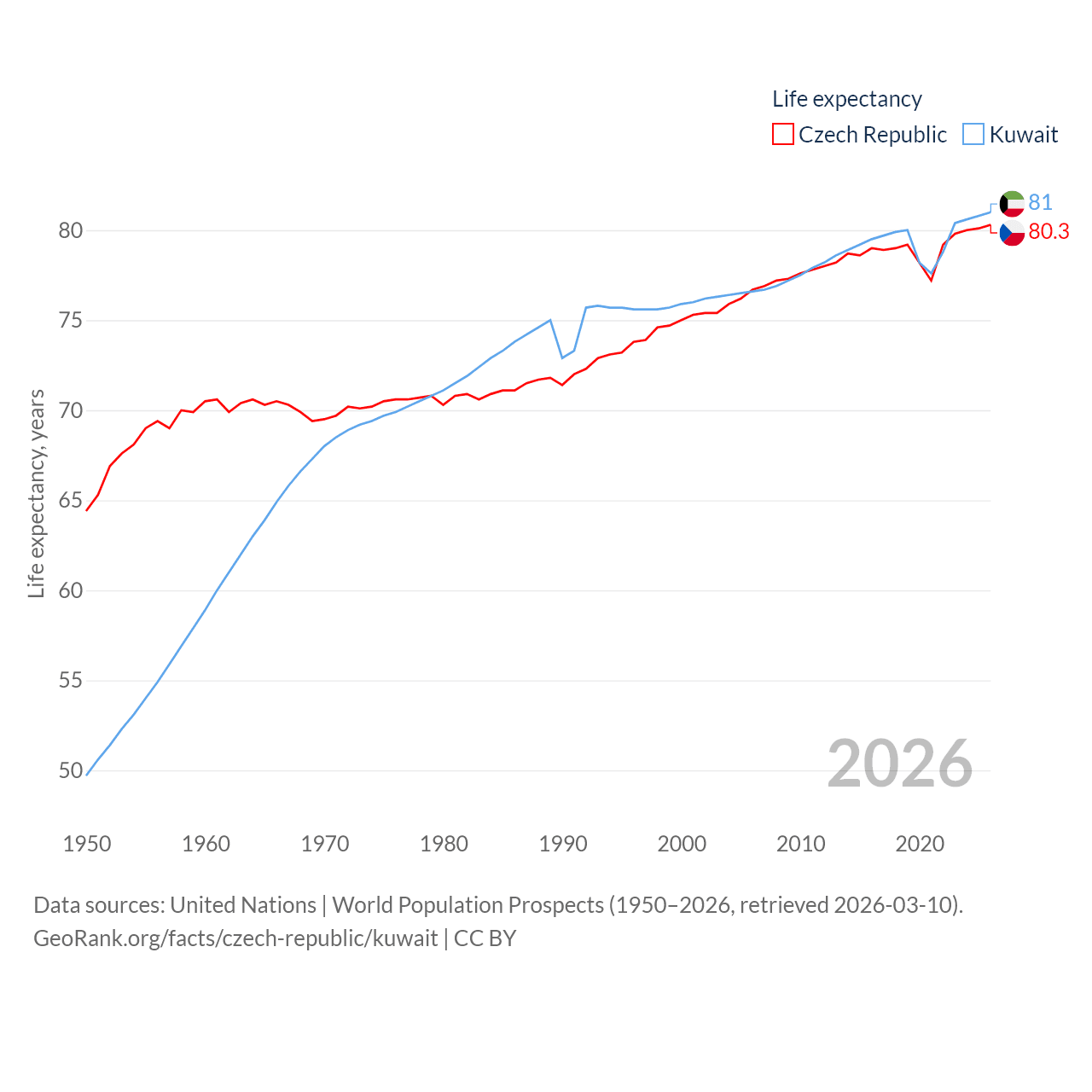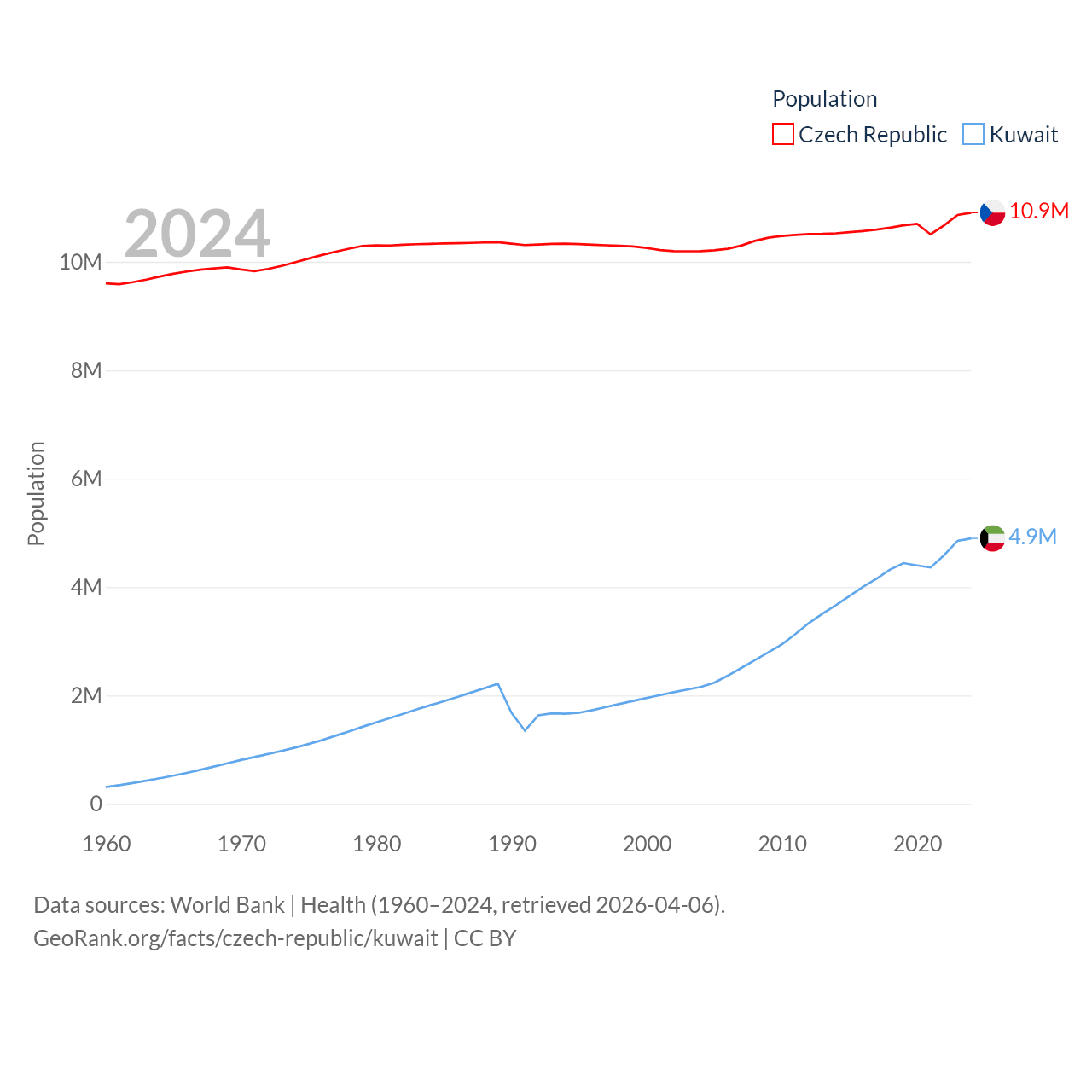 The Czech Republic has a population of 10.9M (ranked 88/197), compared with 4.9M in Kuwait (ranked 127/197). The Czech Republic's land area is 29,794 sq mi versus 6,880 sq mi for Kuwait (ranked 114th vs. 153rd).