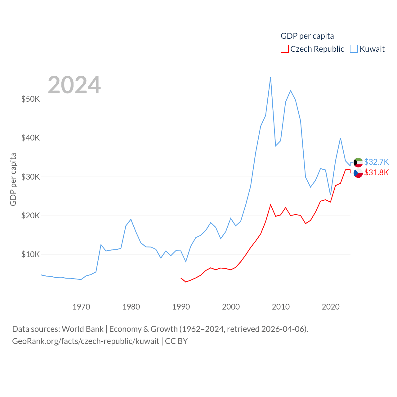 By GDP, The Czech Republic ranks 44/197 ($347B) and Kuwait ranks 59/197 ($160B). By GDP per capita, The Czech Republic ranks 39/197 ($31,823), while Kuwait ranks 37/197 ($32,718).