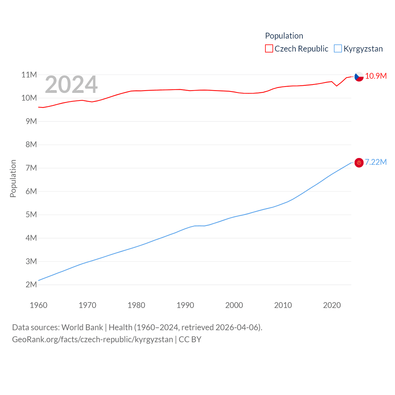 The Czech Republic has a population of 10.9M (ranked 88/197), compared with 7.22M in Kyrgyzstan (ranked 106/197). The Czech Republic's land area is 29,794 sq mi versus 74,054 sq mi for Kyrgyzstan (ranked 114th vs. 86th).