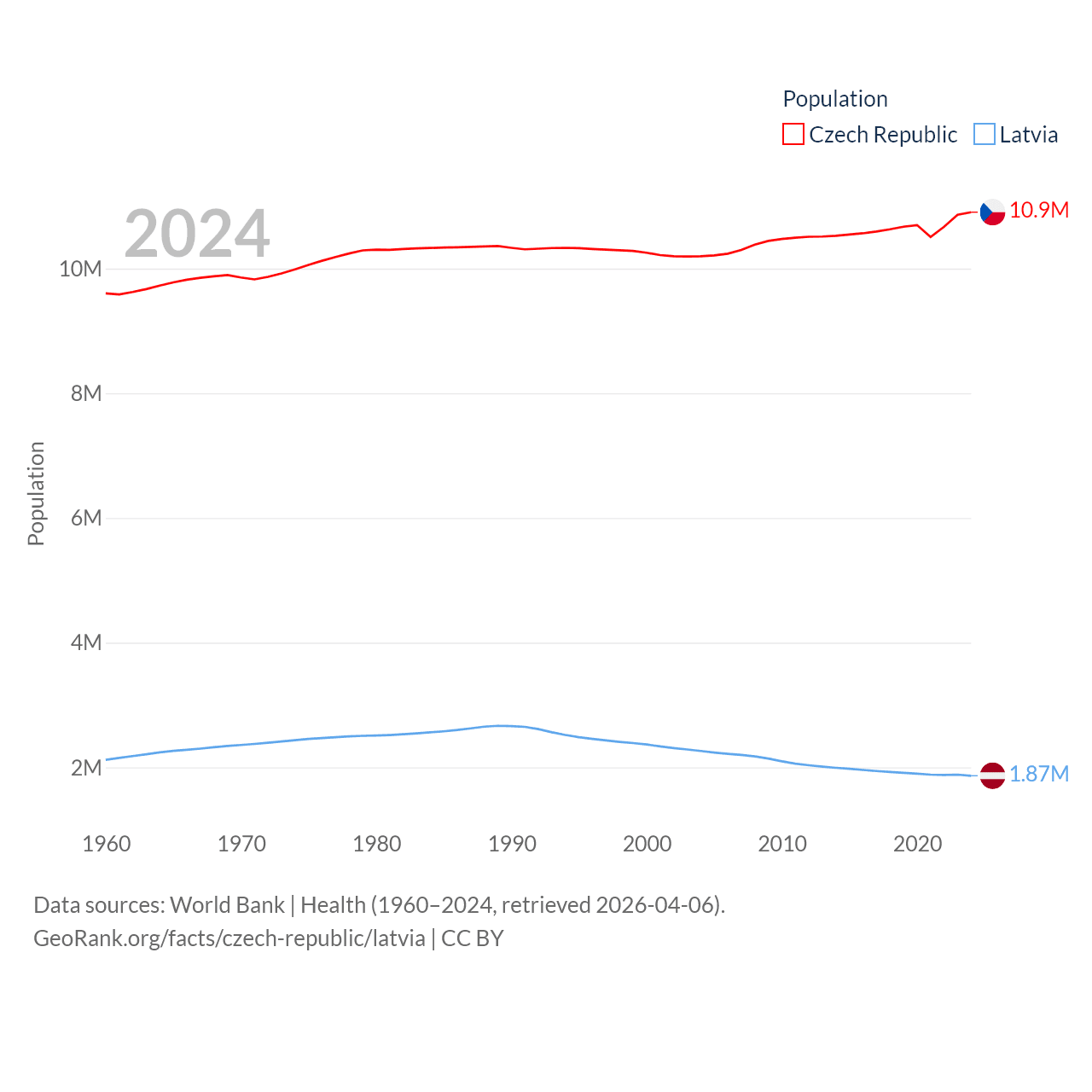 The Czech Republic has a population of 10.9M (ranked 88/197), compared with 1.87M in Latvia (ranked 149/197). The Czech Republic's land area is 29,794 sq mi versus 24,027 sq mi for Latvia (ranked 114th vs. 121st).