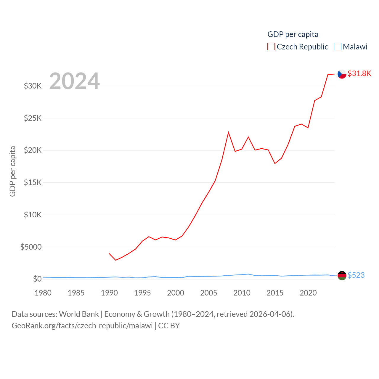 By GDP, The Czech Republic ranks 44/197 ($347B) and Malawi ranks 151/197 ($11.3B). By GDP per capita, The Czech Republic ranks 39/197 ($31,823), while Malawi ranks 194/197 ($523).