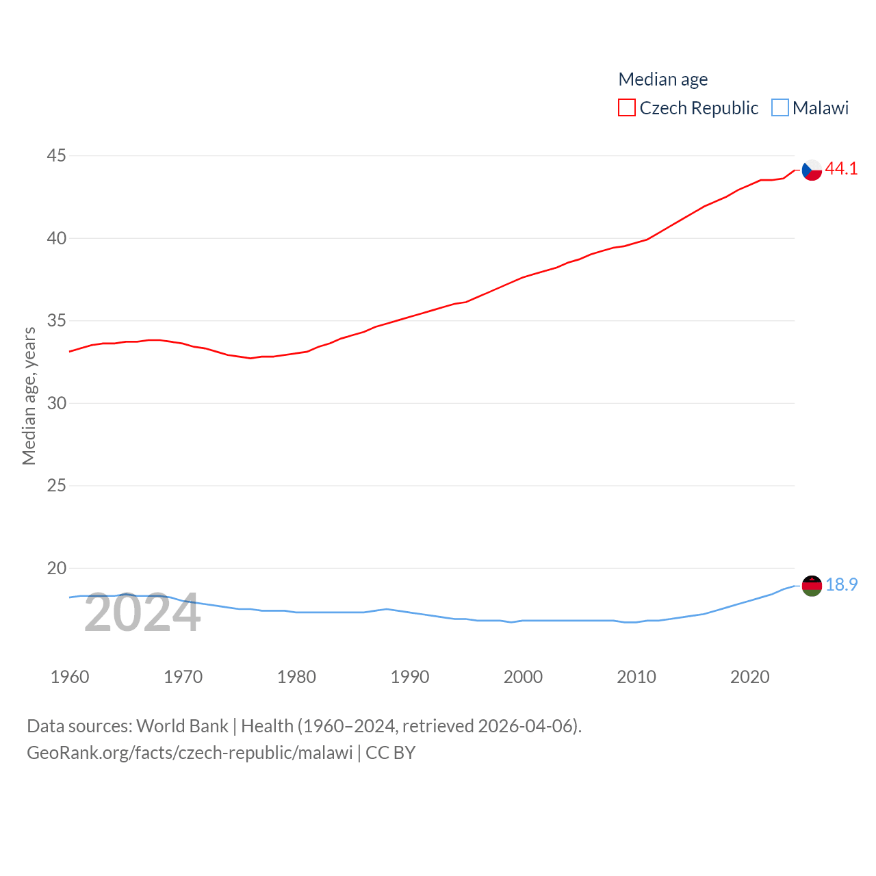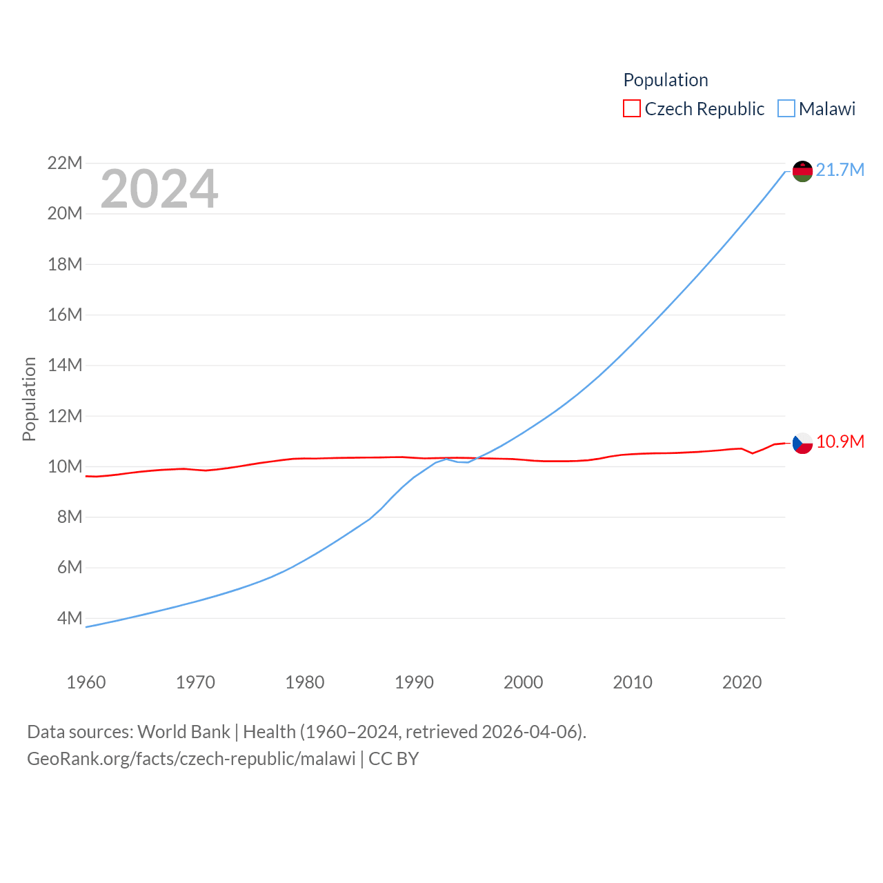 The Czech Republic has a population of 10.9M (ranked 88/197), compared with 21.7M in Malawi (ranked 62/197). The Czech Republic's land area is 29,794 sq mi versus 36,402 sq mi for Malawi (ranked 114th vs. 107th).