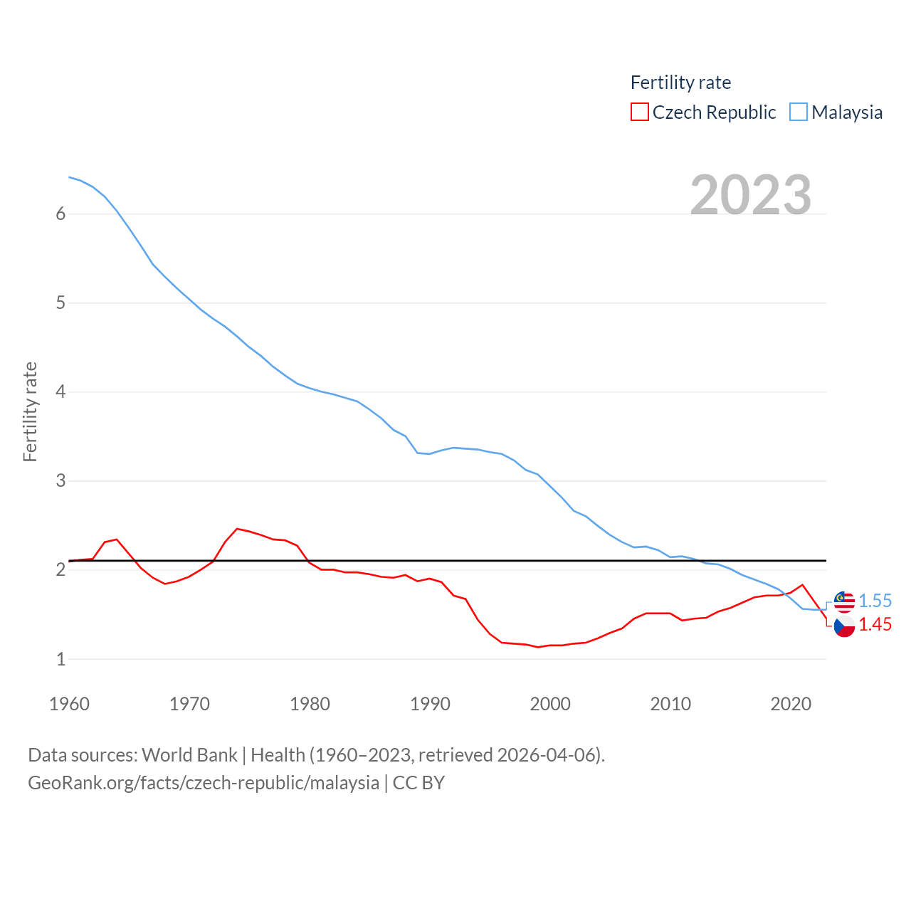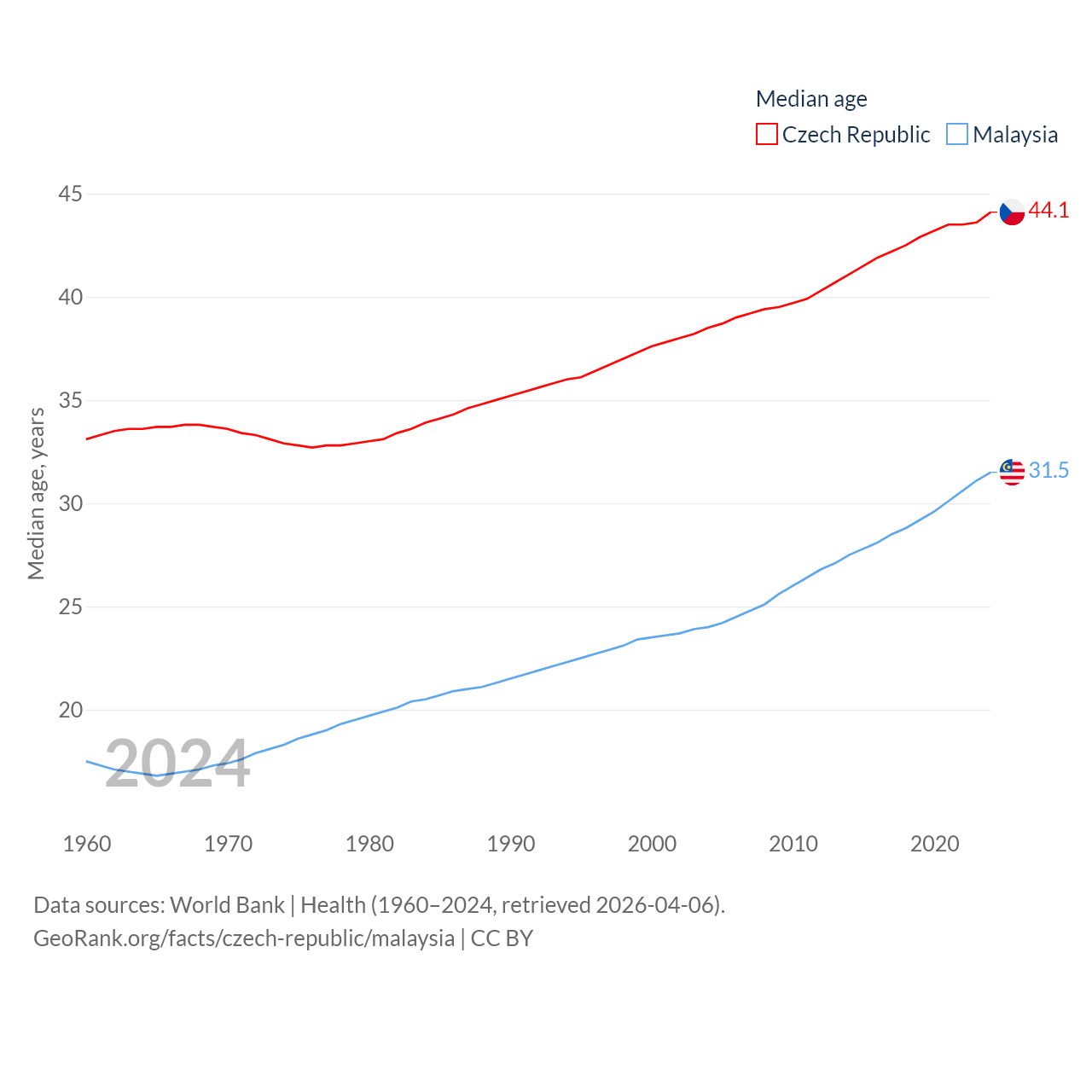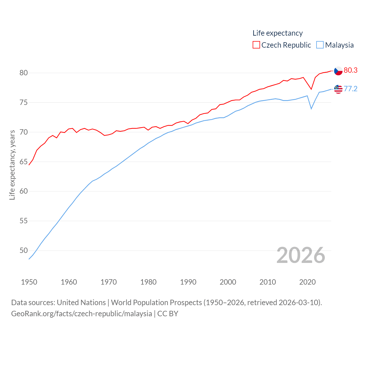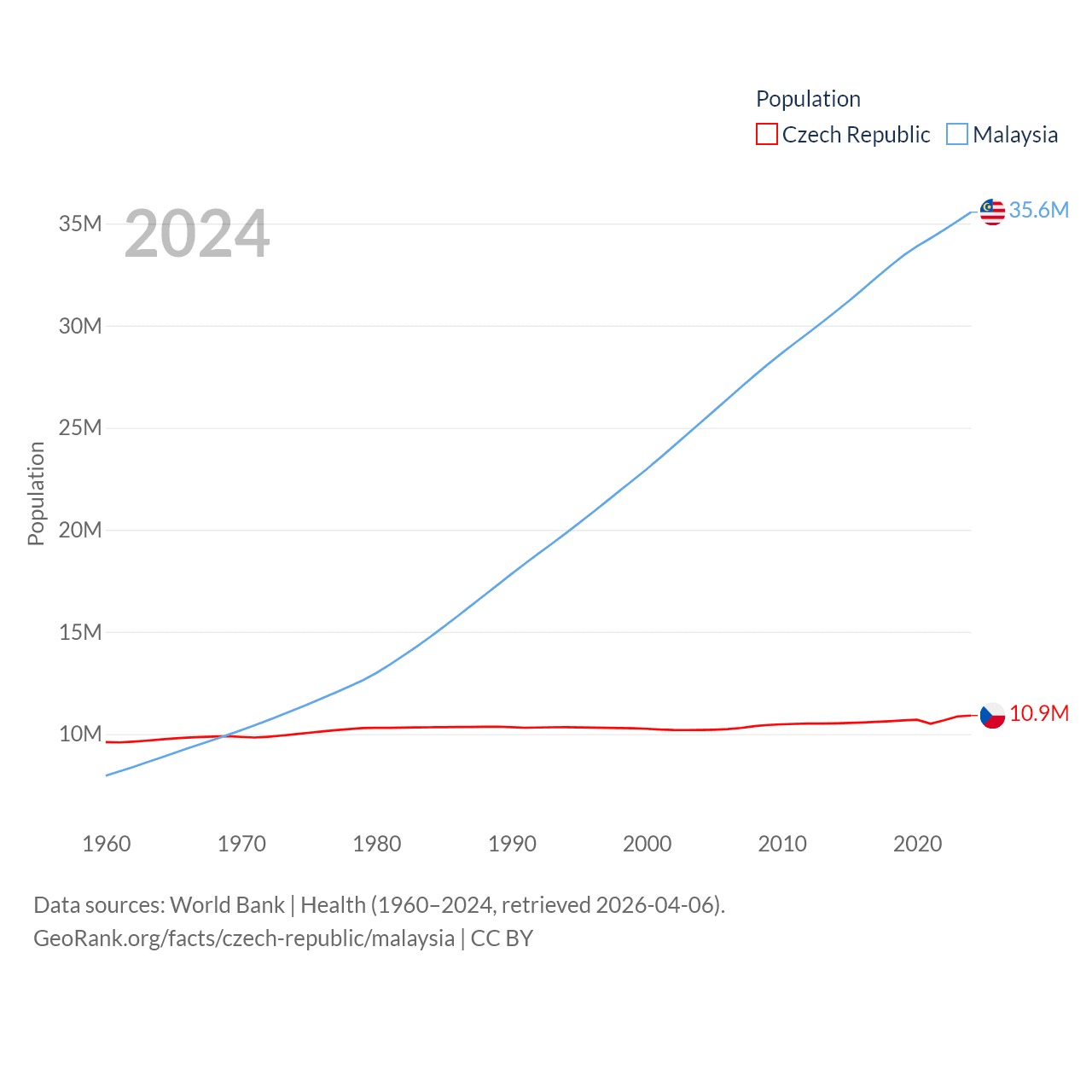 The Czech Republic has a population of 10.9M (ranked 88/197), compared with 35.6M in Malaysia (ranked 44/197). The Czech Republic's land area is 29,794 sq mi versus 126,854 sq mi for Malaysia (ranked 114th vs. 65th).