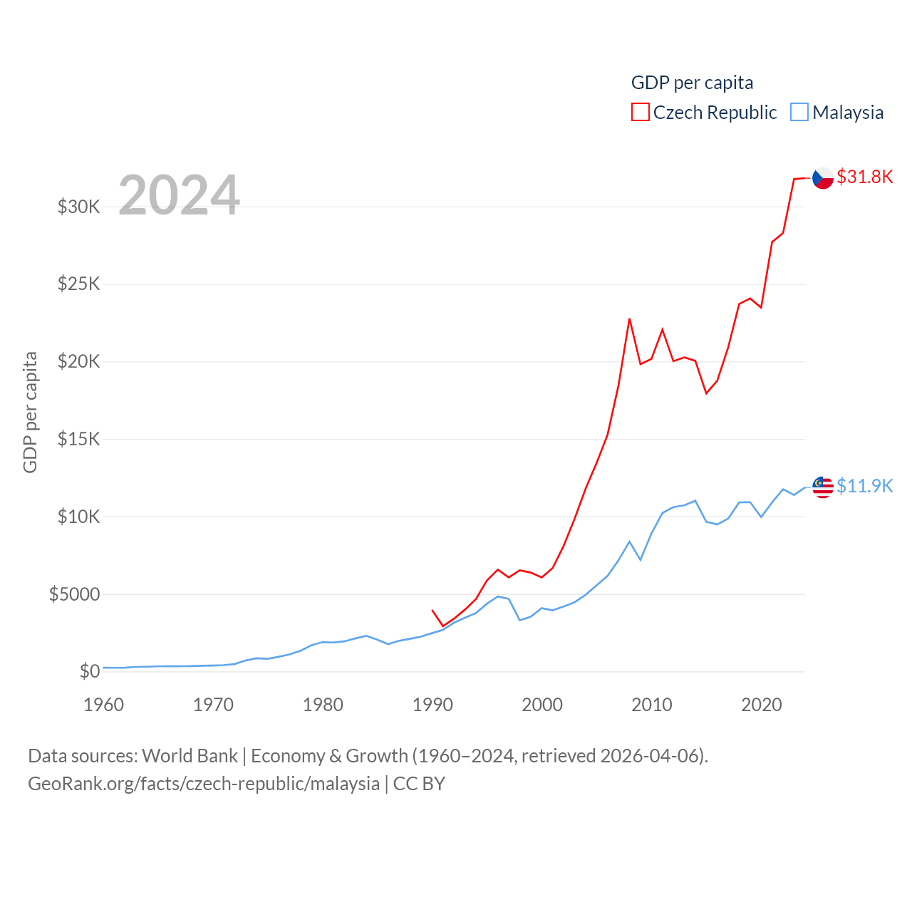 By GDP, The Czech Republic ranks 44/197 ($347B) and Malaysia ranks 38/197 ($422B). By GDP per capita, The Czech Republic ranks 39/197 ($31,823), while Malaysia ranks 79/197 ($11,874).
