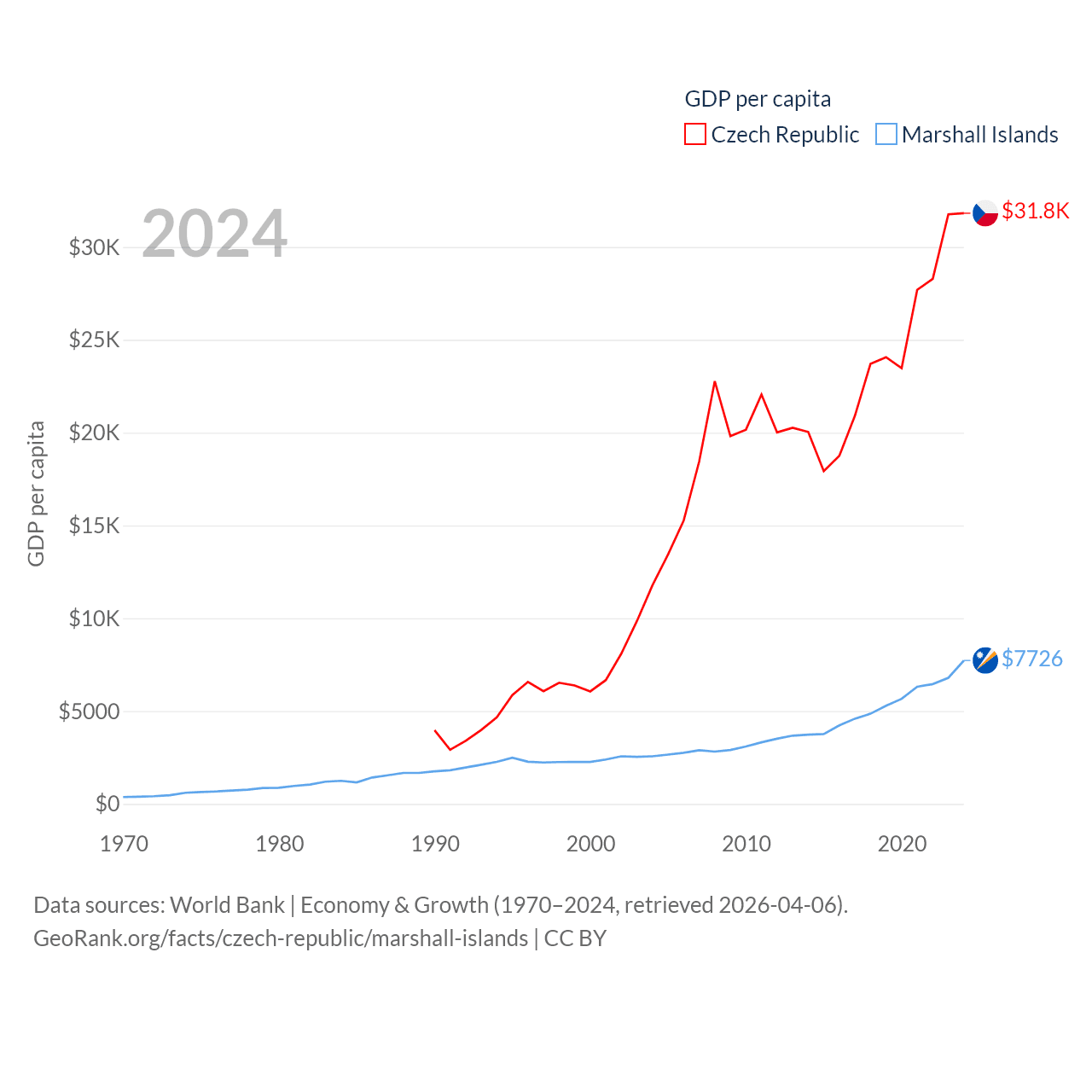 By GDP, The Czech Republic ranks 44/197 ($347B) and The Marshall Islands ranks 193/197 ($290M). By GDP per capita, The Czech Republic ranks 39/197 ($31,823), while The Marshall Islands ranks 96/197 ($7,726).