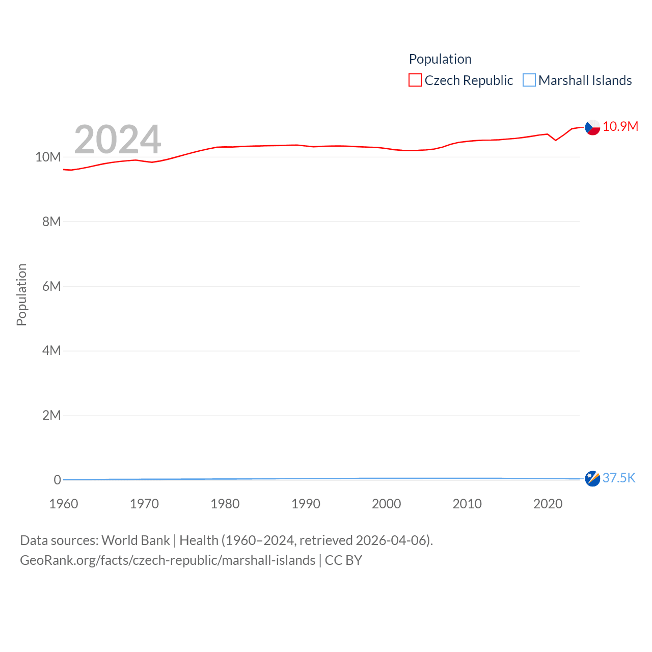 The Czech Republic has a population of 10.9M (ranked 88/197), compared with 37.5K in The Marshall Islands (ranked 192/197). The Czech Republic's land area is 29,794 sq mi versus 69.5 sq mi for The Marshall Islands (ranked 114th vs. 191st).