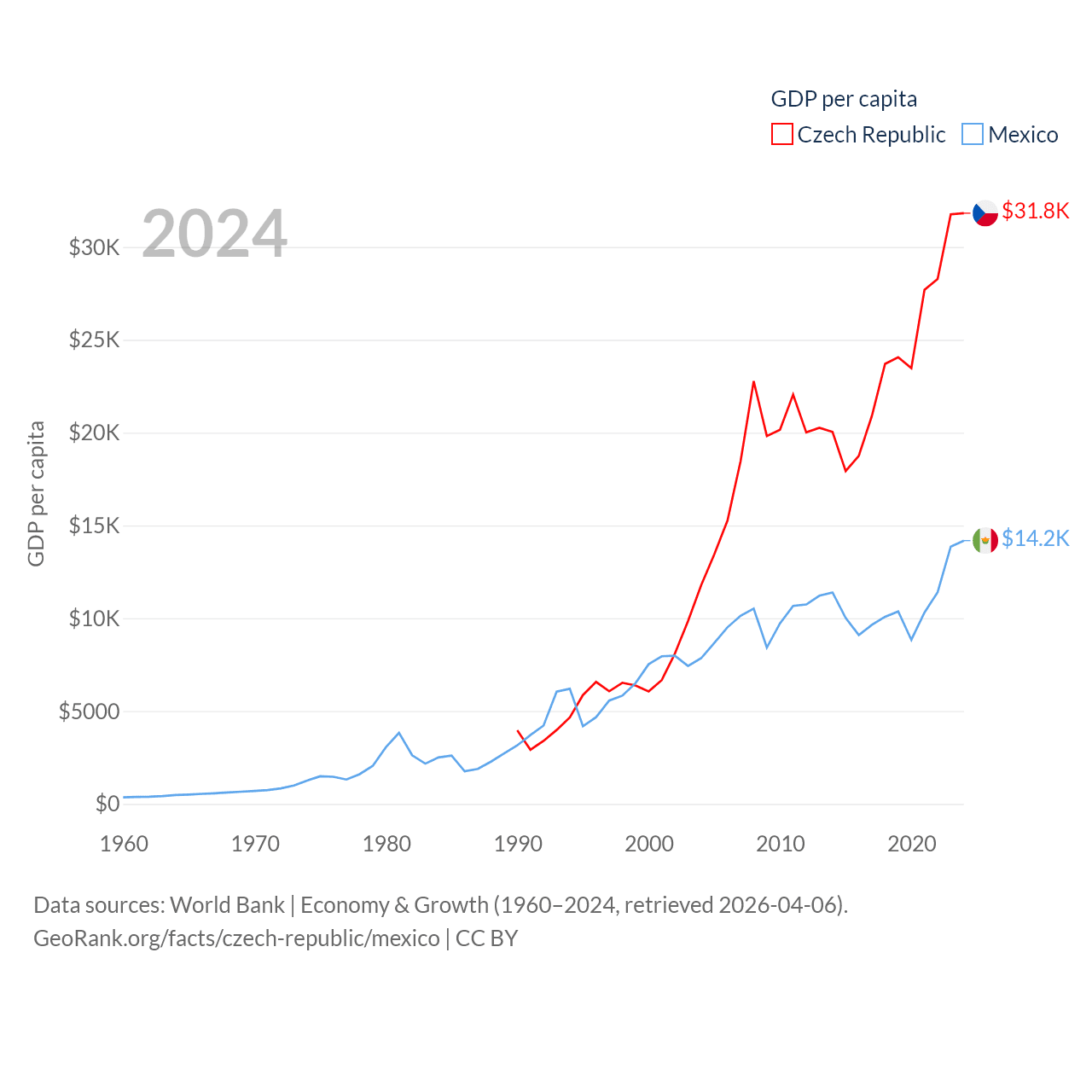 By GDP, The Czech Republic ranks 44/197 ($347B) and Mexico ranks 13/197 ($1.86T). By GDP per capita, The Czech Republic ranks 39/197 ($31,823), while Mexico ranks 69/197 ($14,186).