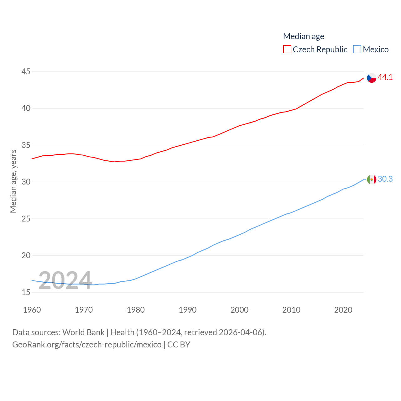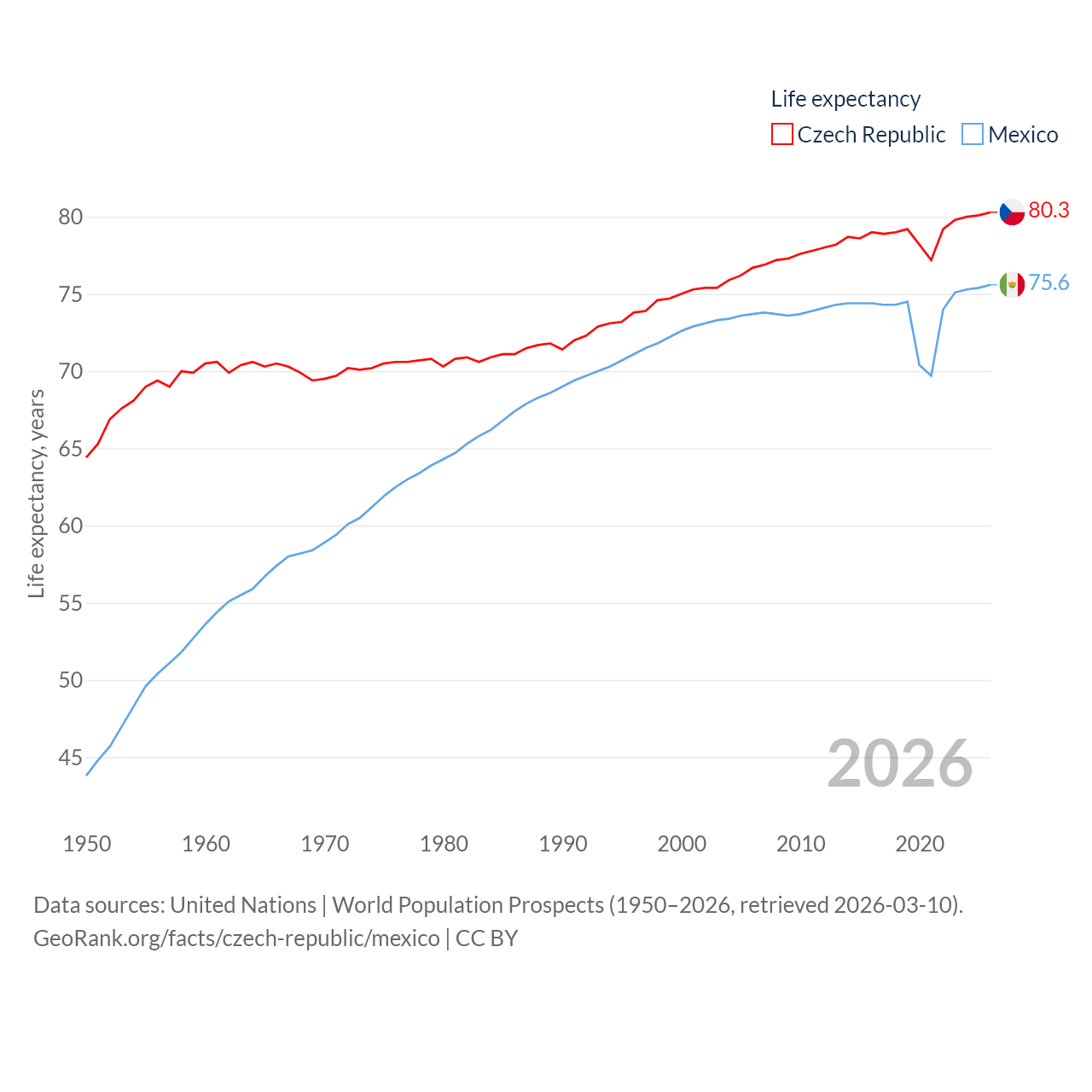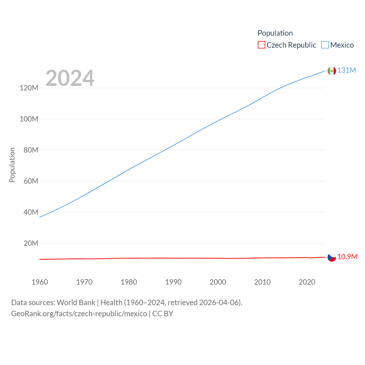 The Czech Republic has a population of 10.9M (ranked 88/197), compared with 131M in Mexico (ranked 11/197). The Czech Republic's land area is 29,794 sq mi versus 750,563 sq mi for Mexico (ranked 114th vs. 13th).