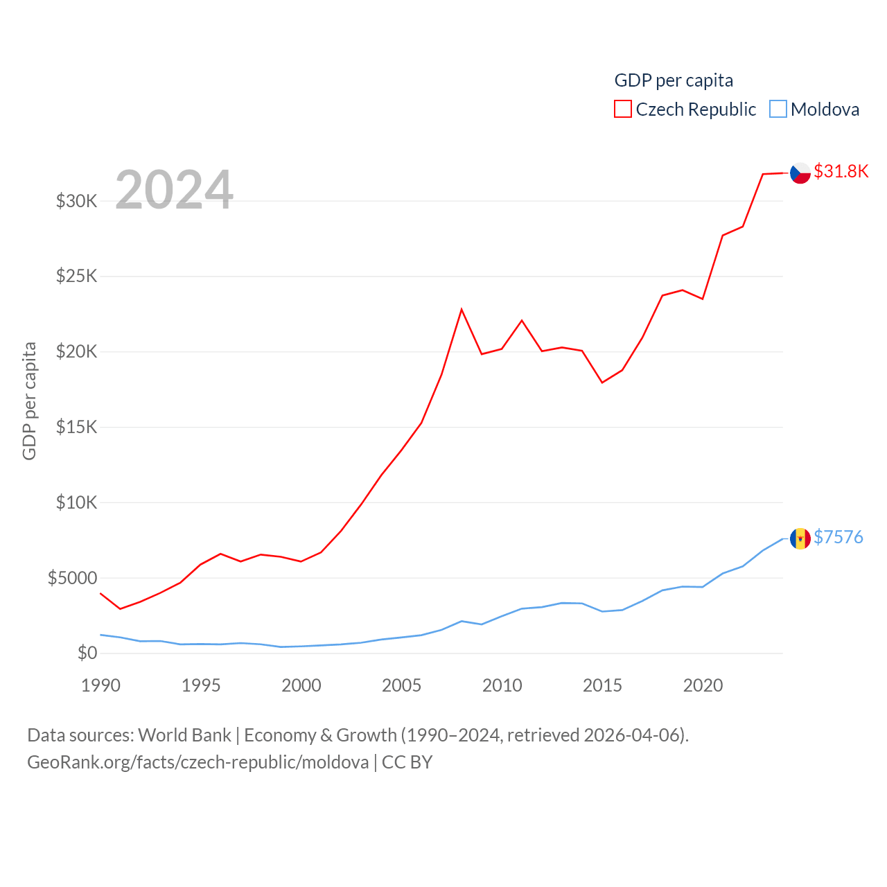 By GDP, The Czech Republic ranks 44/197 ($347B) and Moldova ranks 134/197 ($18.2B). By GDP per capita, The Czech Republic ranks 39/197 ($31,823), while Moldova ranks 99/197 ($7,576).