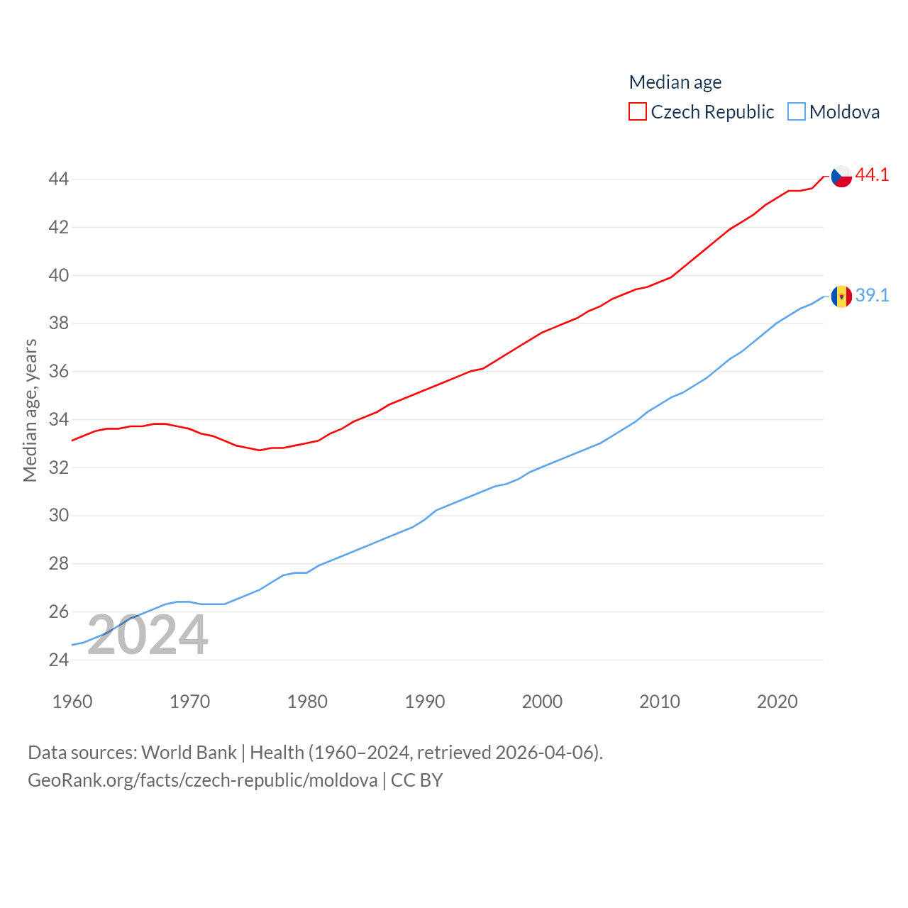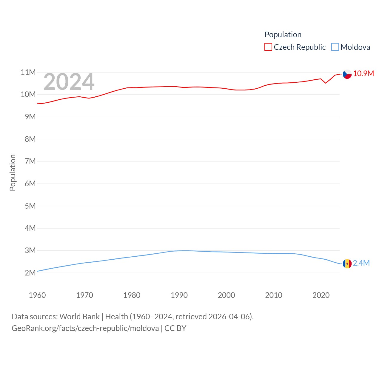 The Czech Republic has a population of 10.9M (ranked 88/197), compared with 2.4M in Moldova (ranked 143/197). The Czech Republic's land area is 29,794 sq mi versus 12,714 sq mi for Moldova (ranked 114th vs. 135th).