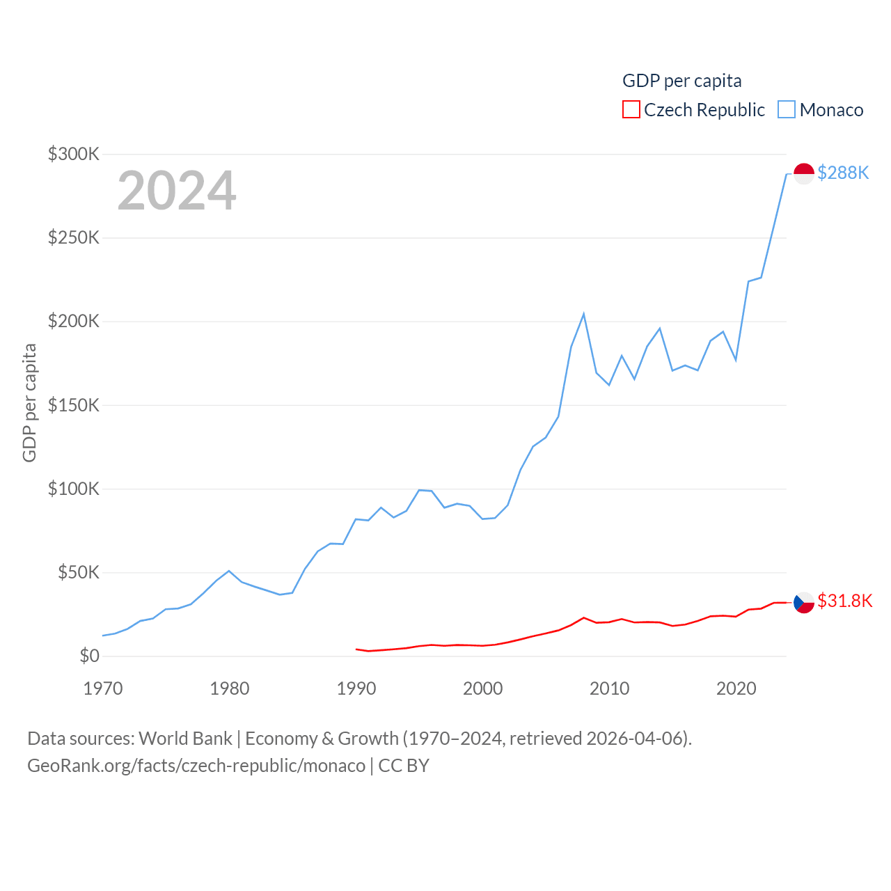 By GDP, The Czech Republic ranks 44/197 ($347B) and Monaco ranks 152/197 ($11.1B). By GDP per capita, The Czech Republic ranks 39/197 ($31,823), while Monaco ranks 1/197 ($288,001).