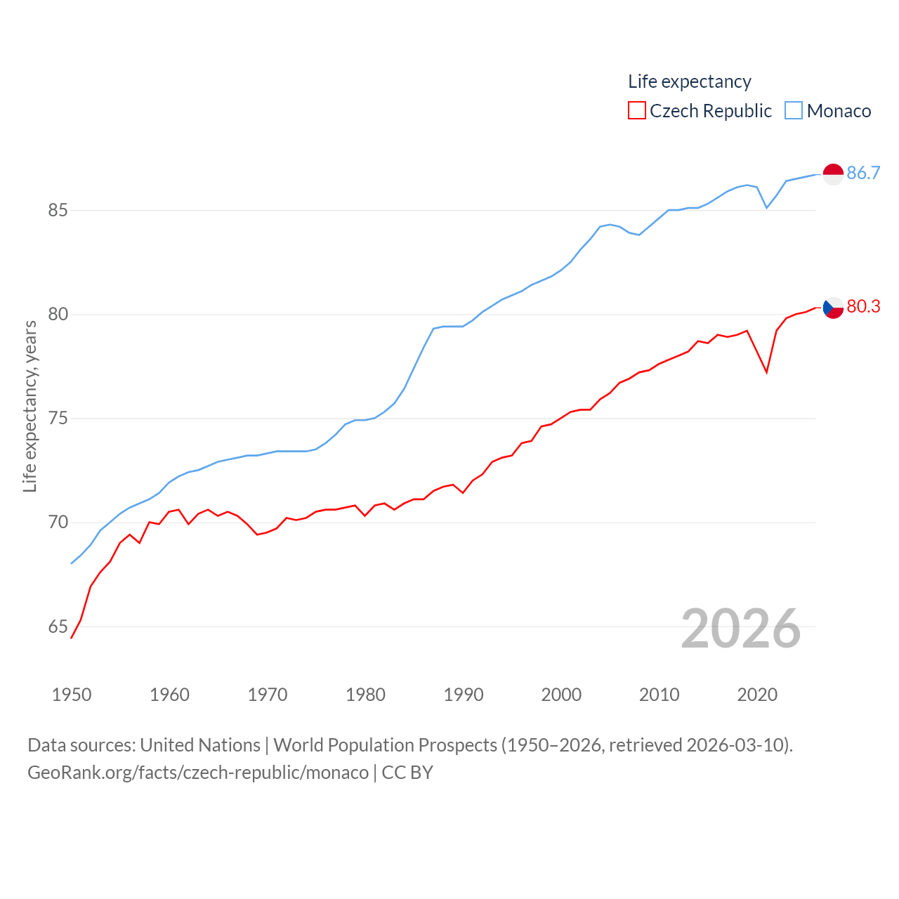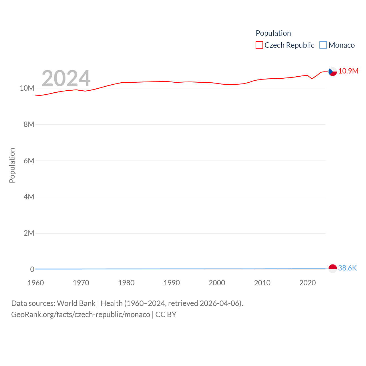 The Czech Republic has a population of 10.9M (ranked 88/197), compared with 38.6K in Monaco (ranked 191/197). The Czech Republic's land area is 29,794 sq mi versus 0.8 sq mi for Monaco (ranked 114th vs. 196th).