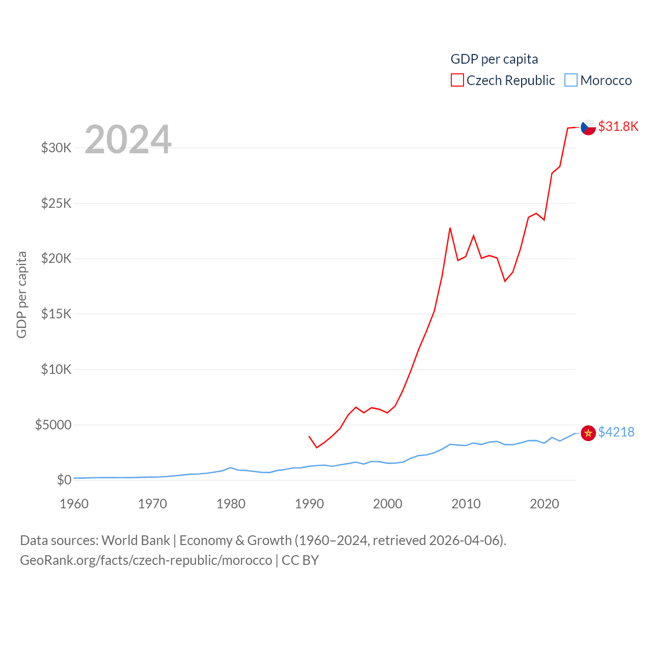 By GDP, The Czech Republic ranks 44/197 ($347B) and Morocco ranks 58/197 ($161B). By GDP per capita, The Czech Republic ranks 39/197 ($31,823), while Morocco ranks 127/197 ($4,218).
