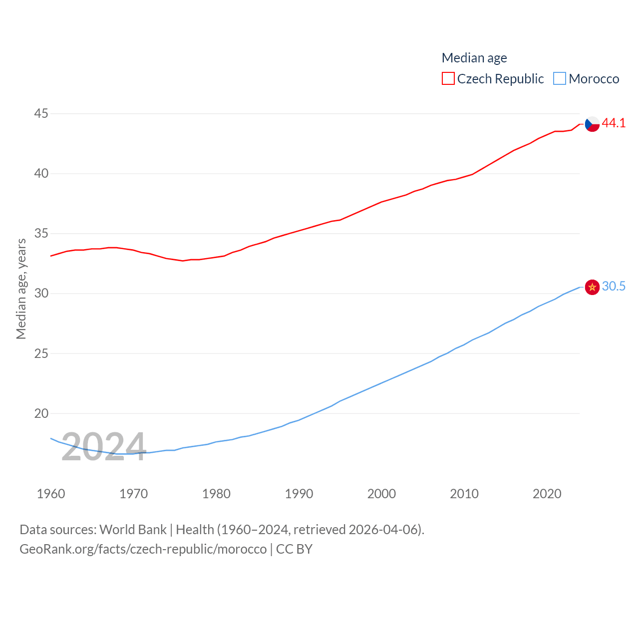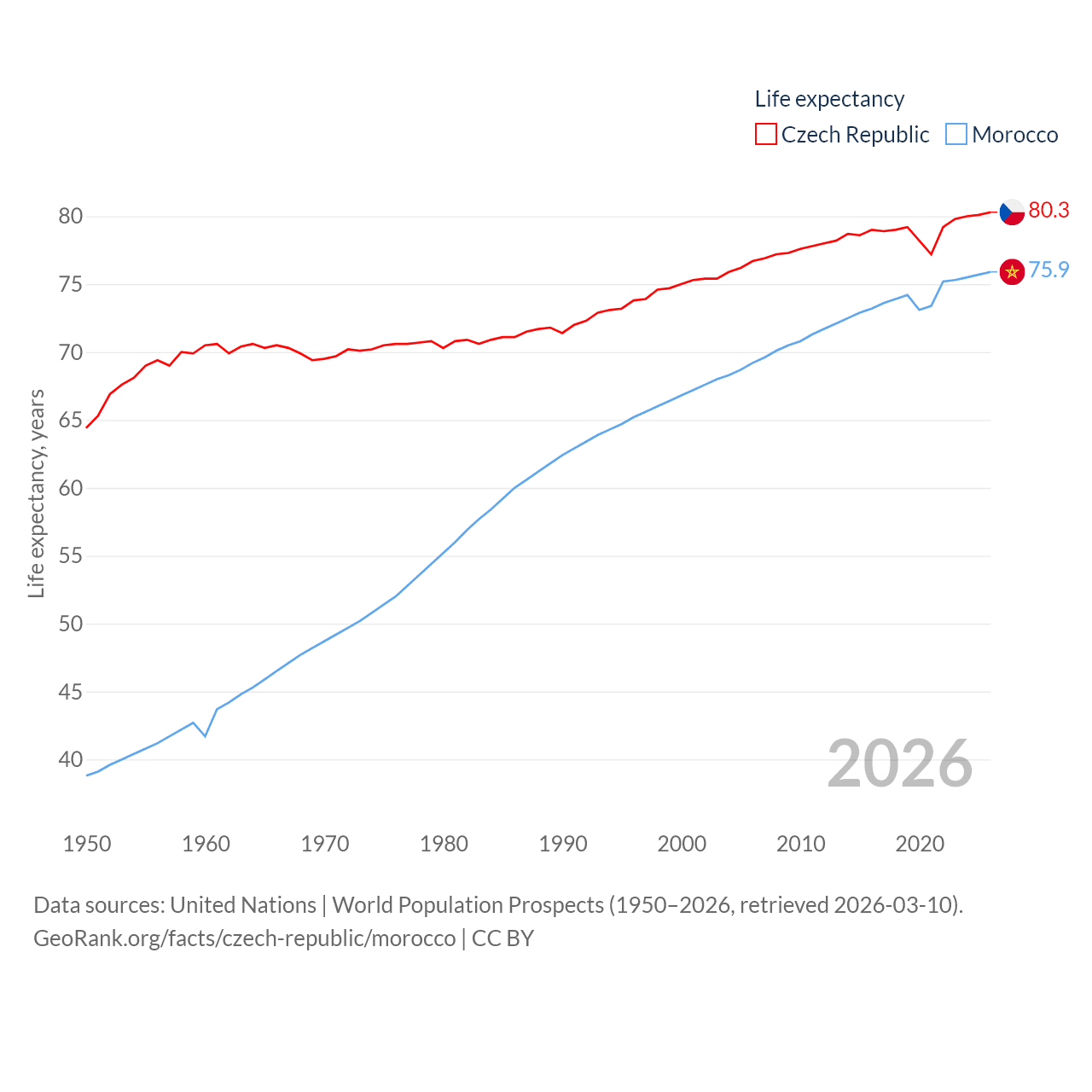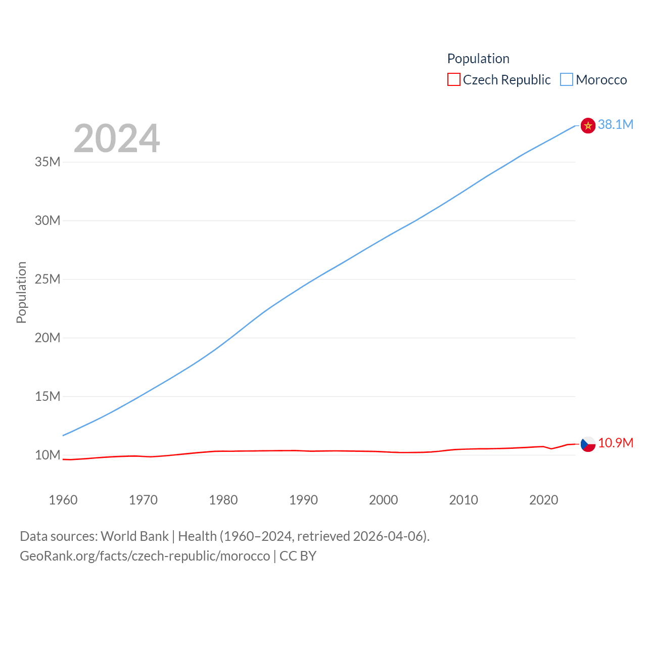 The Czech Republic has a population of 10.9M (ranked 88/197), compared with 38.1M in Morocco (ranked 39/197). The Czech Republic's land area is 29,794 sq mi versus 172,317 sq mi for Morocco (ranked 114th vs. 55th).