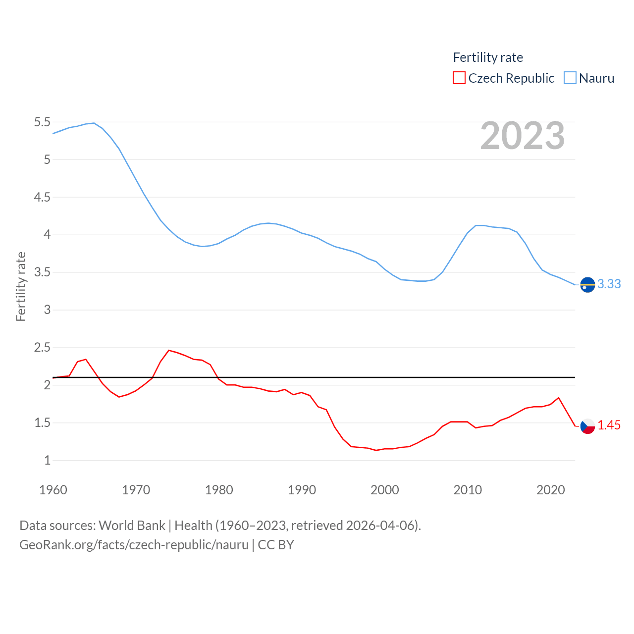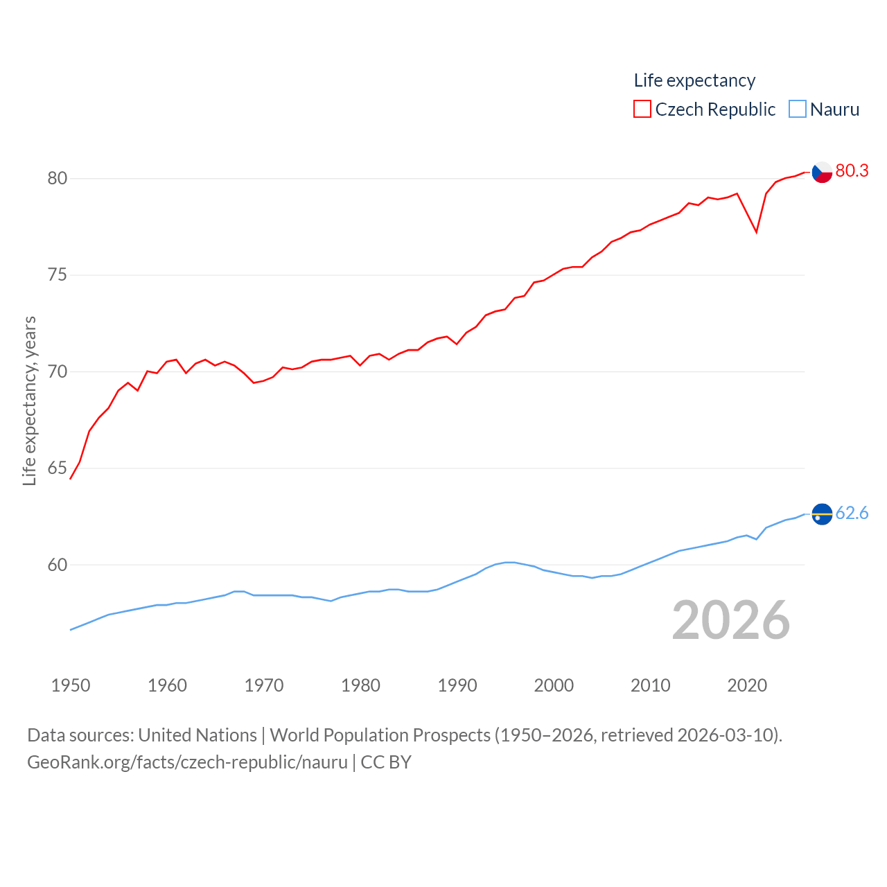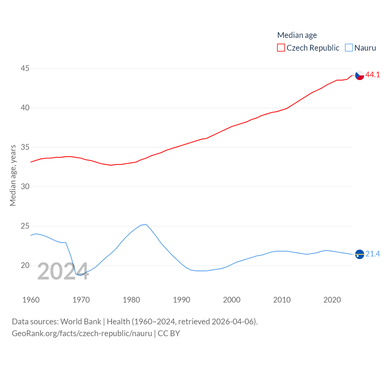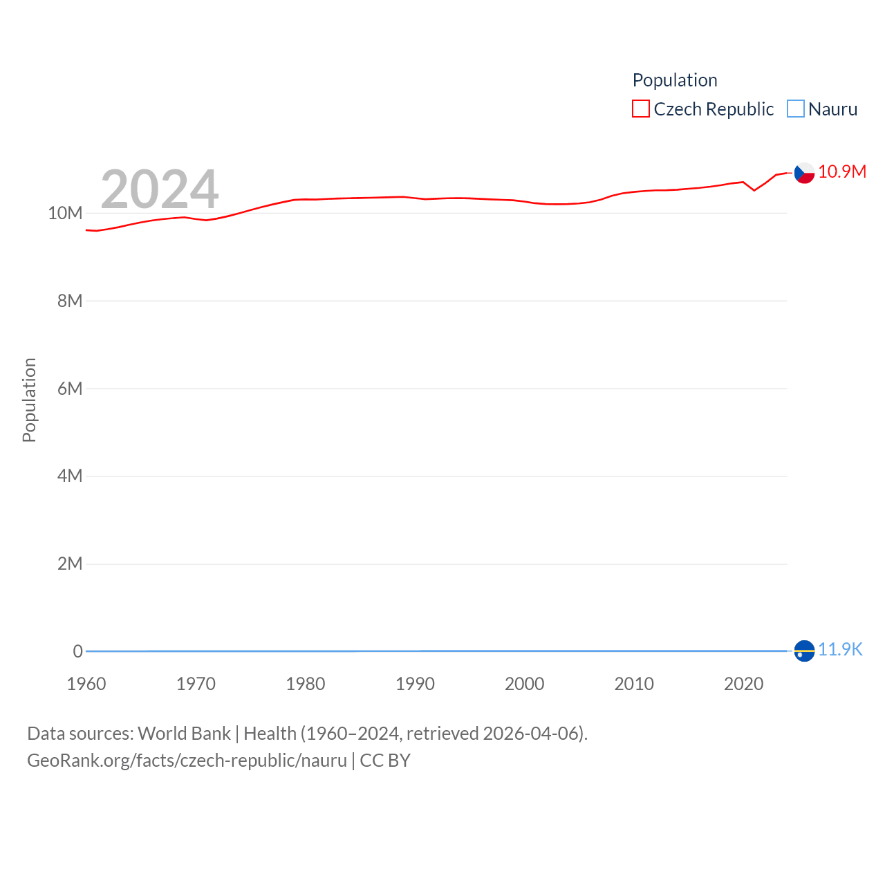 The Czech Republic has a population of 10.9M (ranked 88/197), compared with 11.9K in Nauru (ranked 195/197). The Czech Republic's land area is 29,794 sq mi versus 7.72 sq mi for Nauru (ranked 114th vs. 195th).