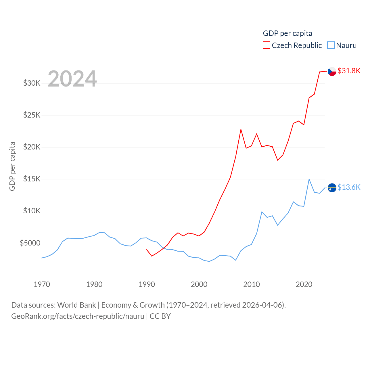 By GDP, The Czech Republic ranks 44/197 ($347B) and Nauru ranks 195/197 ($163M). By GDP per capita, The Czech Republic ranks 39/197 ($31,823), while Nauru ranks 74/197 ($13,609).