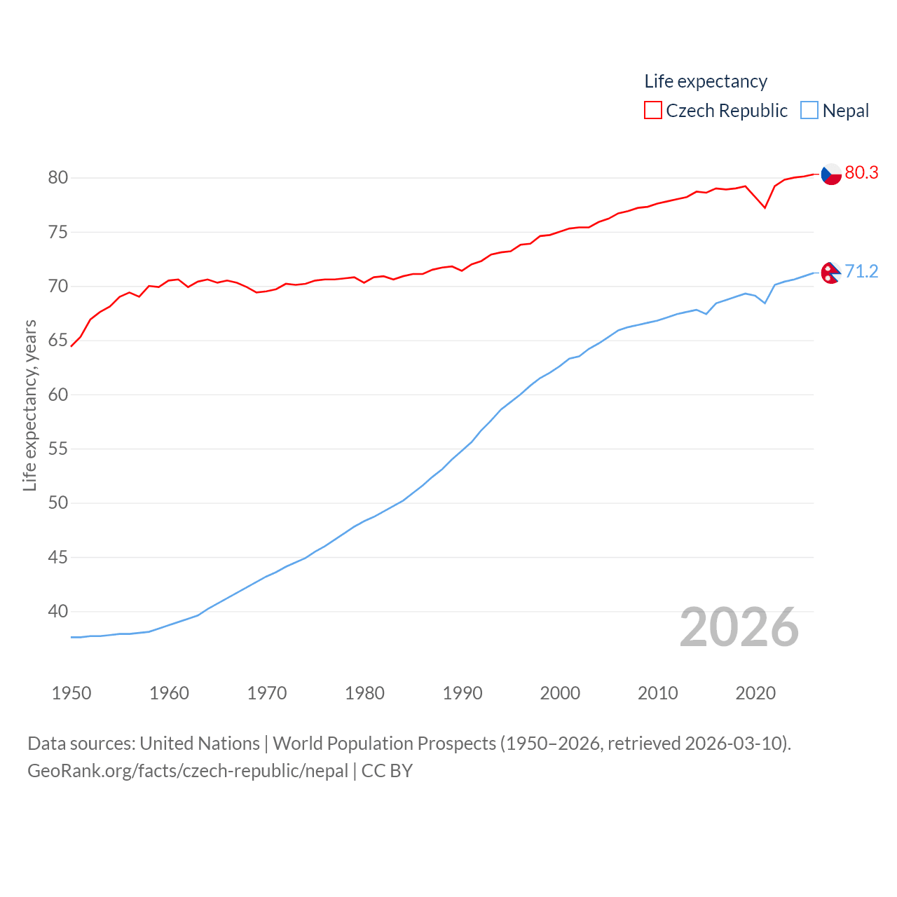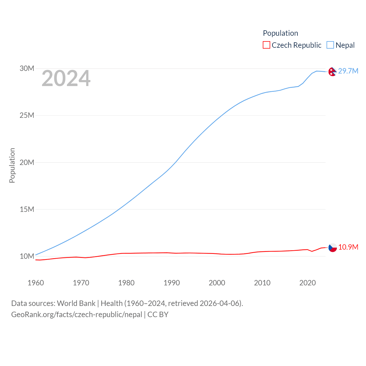 The Czech Republic has a population of 10.9M (ranked 88/197), compared with 29.7M in Nepal (ranked 51/197). The Czech Republic's land area is 29,794 sq mi versus 55,348 sq mi for Nepal (ranked 114th vs. 92nd).