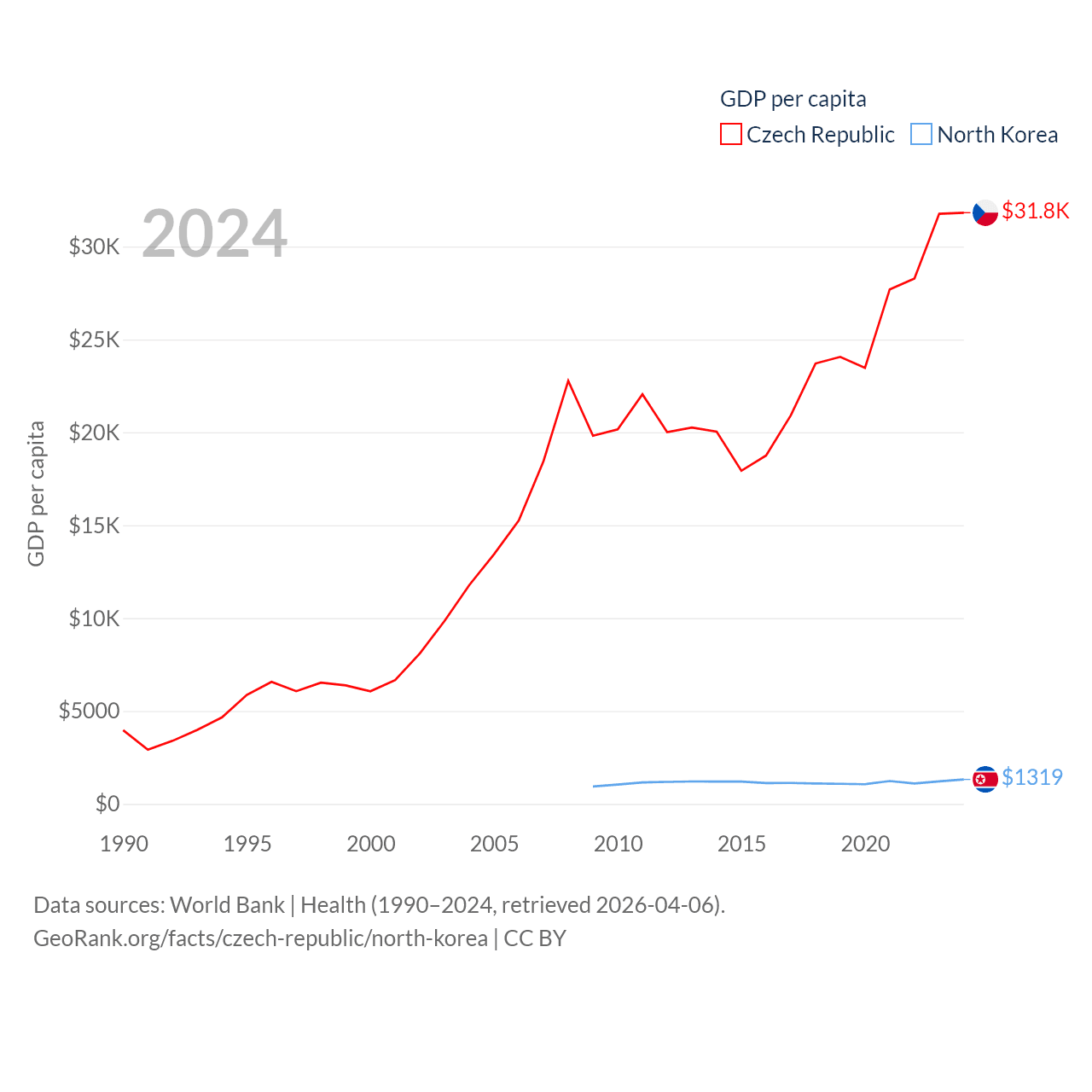 By GDP, The Czech Republic ranks 44/197 ($347B) and North Korea ranks 106/197 ($34.9B). By GDP per capita, The Czech Republic ranks 39/197 ($31,823), while North Korea ranks 168/197 ($1,319).