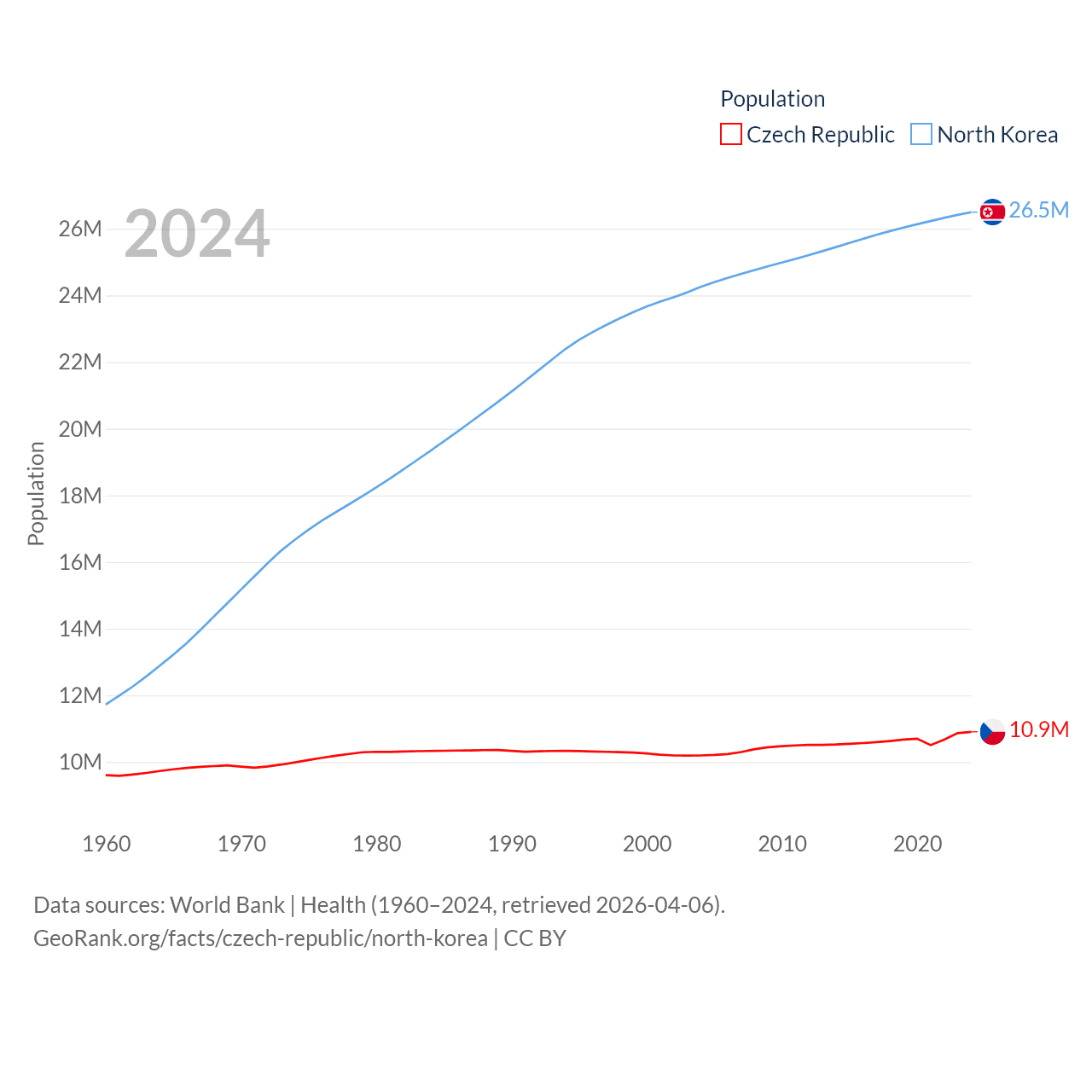 The Czech Republic has a population of 10.9M (ranked 88/197), compared with 26.5M in North Korea (ranked 56/197). The Czech Republic's land area is 29,794 sq mi versus 46,491 sq mi for North Korea (ranked 114th vs. 97th).