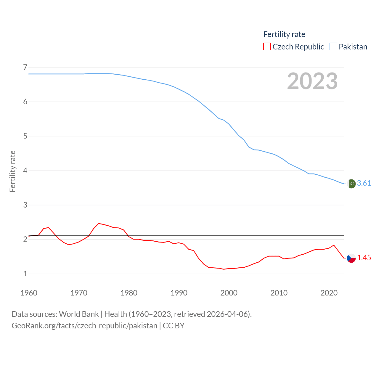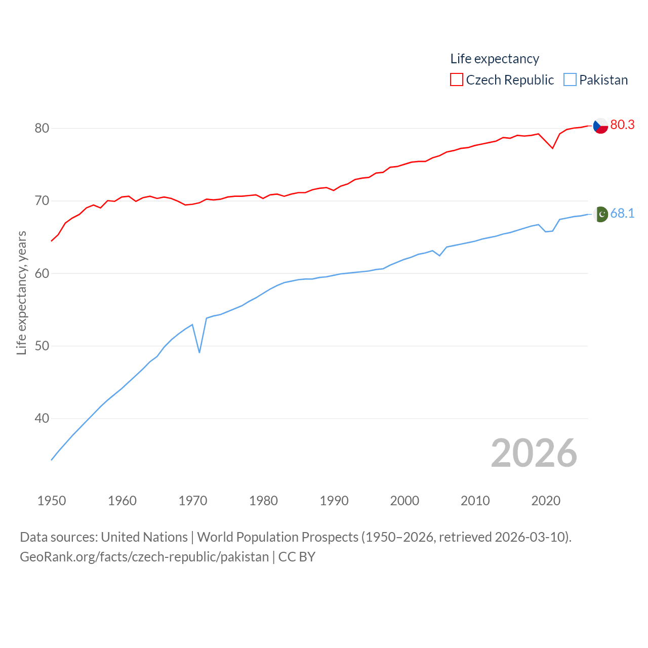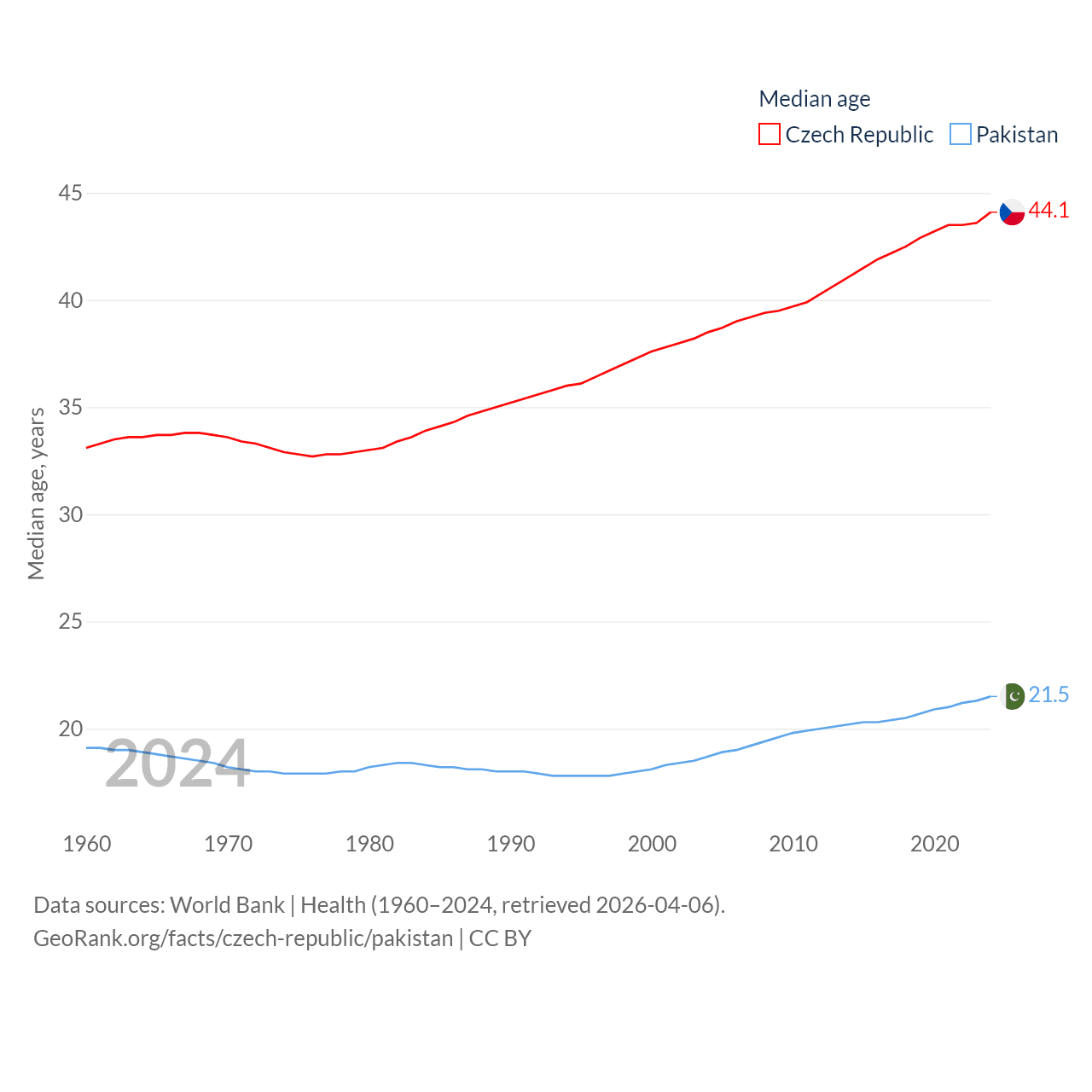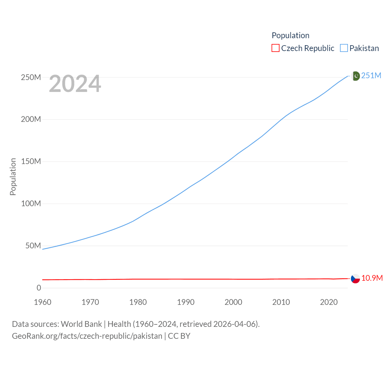 The Czech Republic has a population of 10.9M (ranked 88/197), compared with 251M in Pakistan (ranked 5/197). The Czech Republic's land area is 29,794 sq mi versus 297,638 sq mi for Pakistan (ranked 114th vs. 35th).