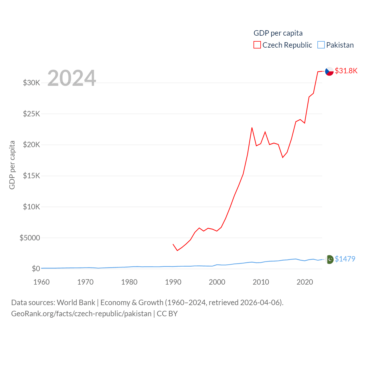 By GDP, The Czech Republic ranks 44/197 ($347B) and Pakistan ranks 43/197 ($372B). By GDP per capita, The Czech Republic ranks 39/197 ($31,823), while Pakistan ranks 163/197 ($1,479).