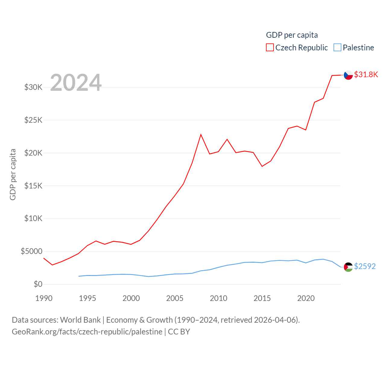 By GDP, The Czech Republic ranks 44/197 ($347B) and Palestine ranks 146/197 ($13.7B). By GDP per capita, The Czech Republic ranks 39/197 ($31,823), while Palestine ranks 147/197 ($2,592).