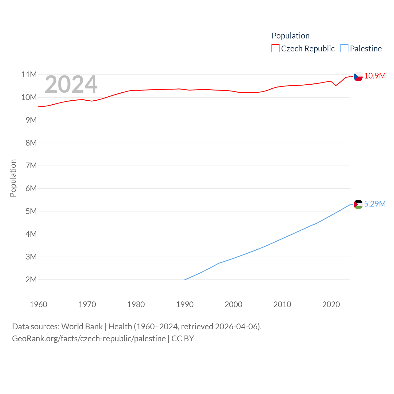 The Czech Republic has a population of 10.9M (ranked 88/197), compared with 5.29M in Palestine (ranked 122/197). The Czech Republic's land area is 29,794 sq mi versus 2,326 sq mi for Palestine (ranked 114th vs. 164th).