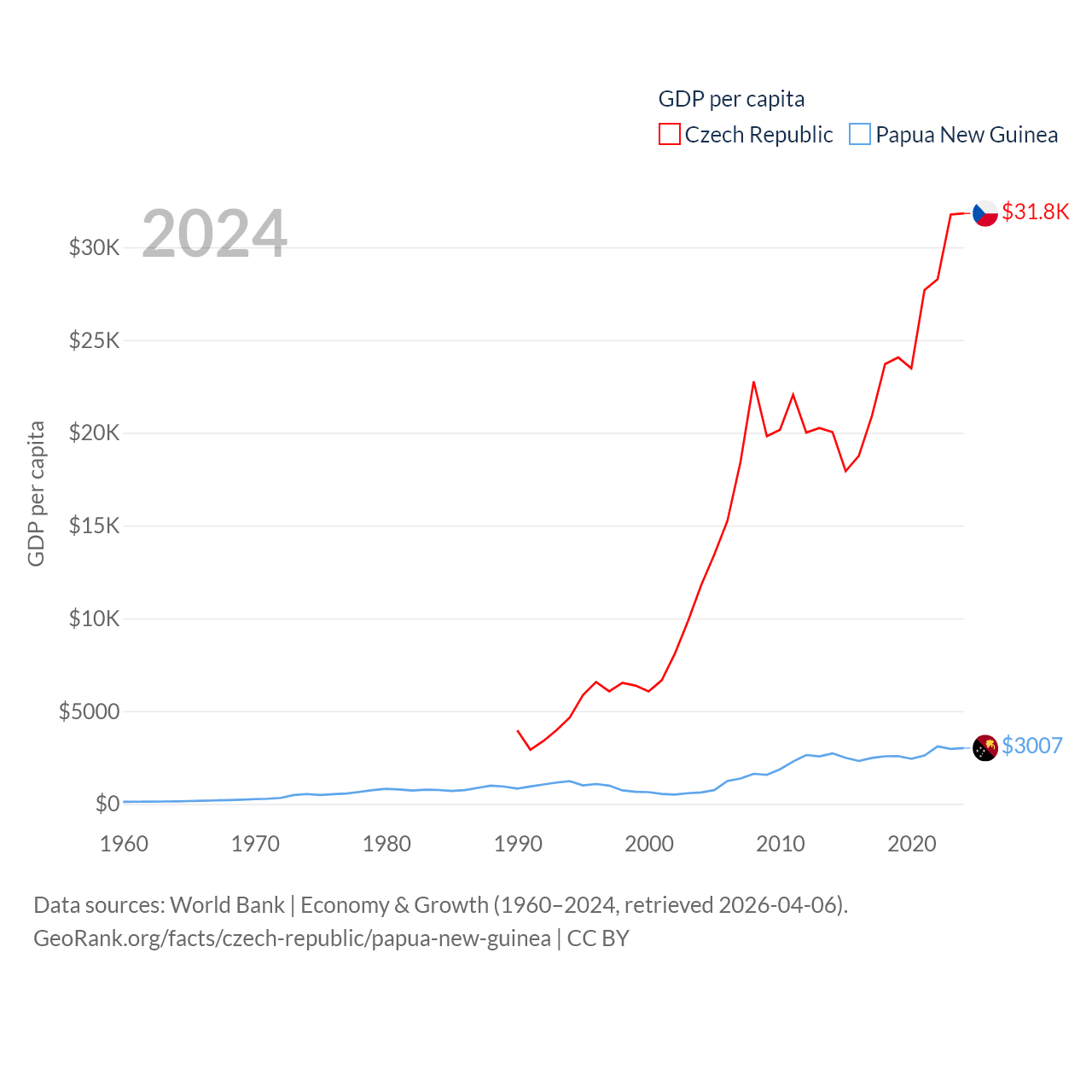 By GDP, The Czech Republic ranks 44/197 ($347B) and Papua New Guinea ranks 110/197 ($31.8B). By GDP per capita, The Czech Republic ranks 39/197 ($31,823), while Papua New Guinea ranks 140/197 ($3,007).