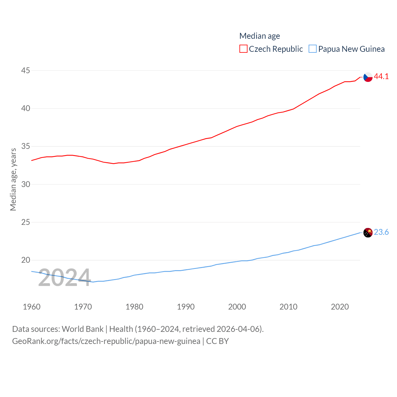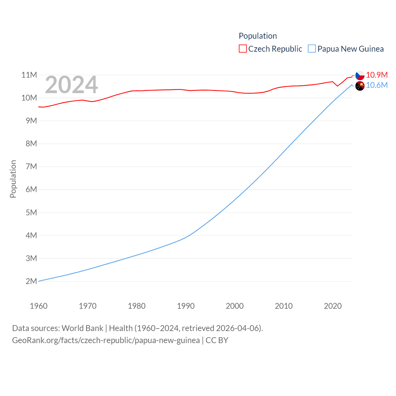 The Czech Republic has a population of 10.9M (ranked 88/197), compared with 10.6M in Papua New Guinea (ranked 92/197). The Czech Republic's land area is 29,794 sq mi versus 174,850 sq mi for Papua New Guinea (ranked 114th vs. 54th).