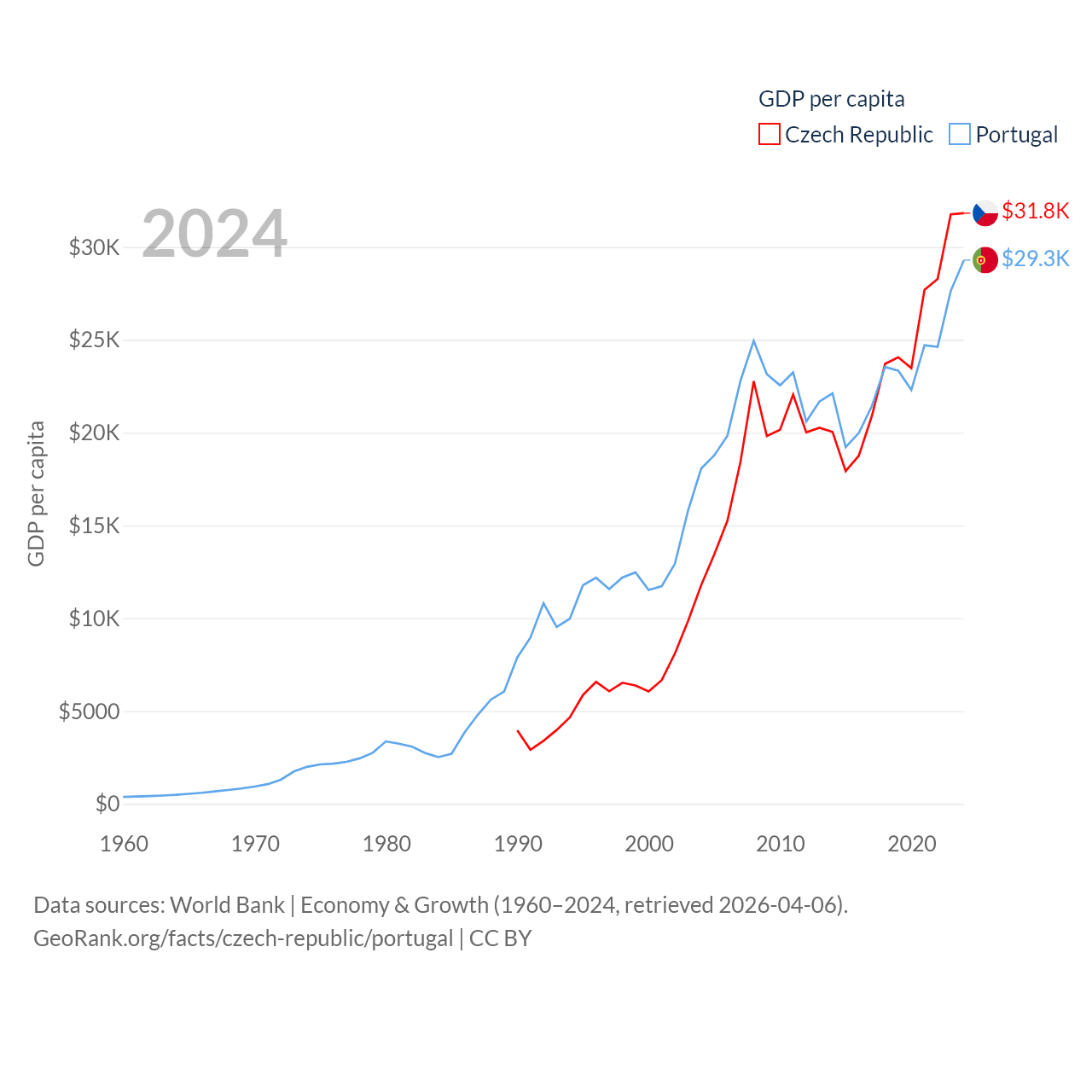 By GDP, The Czech Republic ranks 44/197 ($347B) and Portugal ranks 46/197 ($313B). By GDP per capita, The Czech Republic ranks 39/197 ($31,823), while Portugal ranks 44/197 ($29,292).