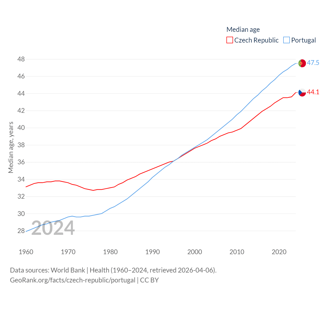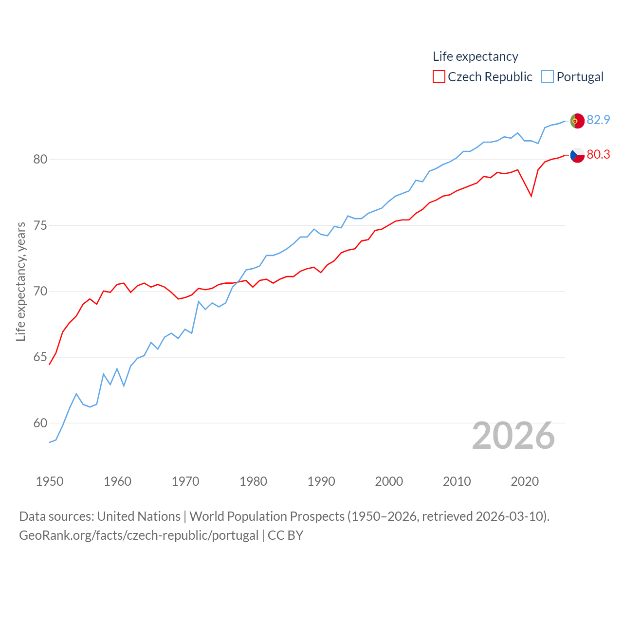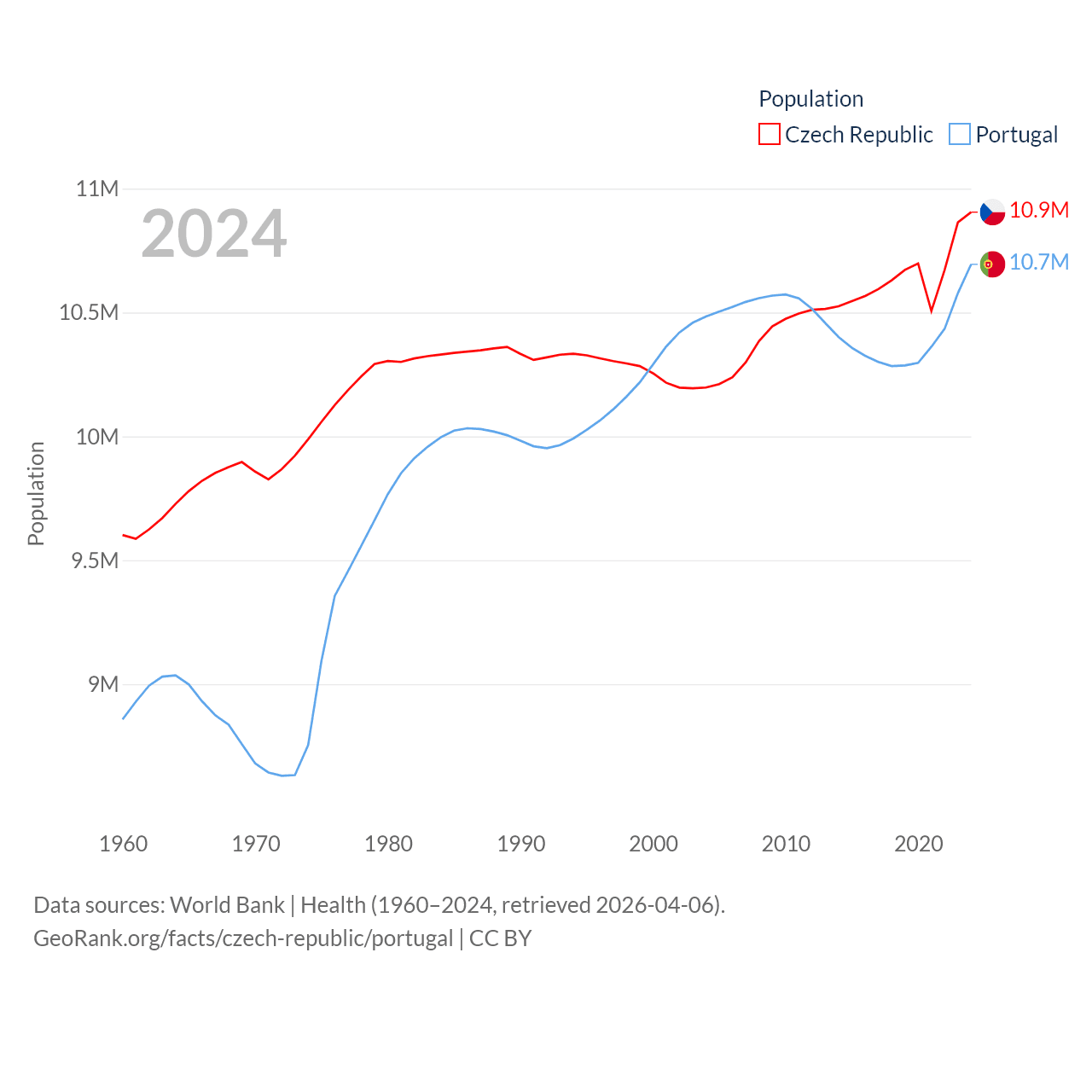 The Czech Republic has a population of 10.9M (ranked 88/197), compared with 10.7M in Portugal (ranked 90/197). The Czech Republic's land area is 29,794 sq mi versus 35,369 sq mi for Portugal (ranked 114th vs. 108th).