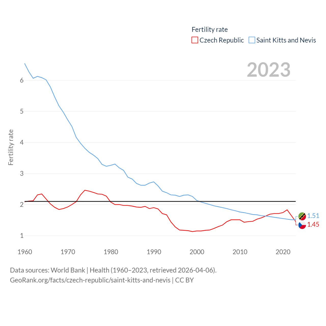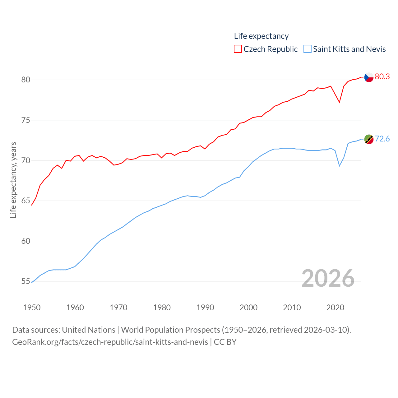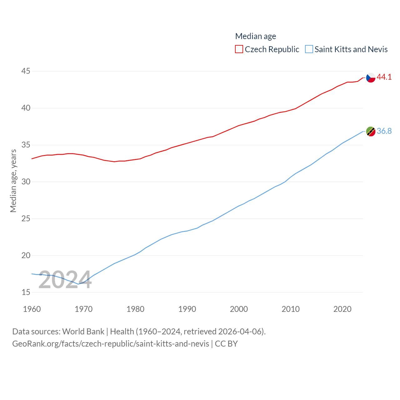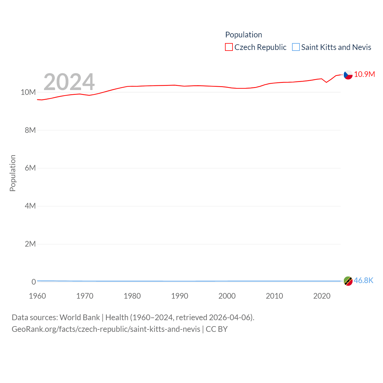 The Czech Republic has a population of 10.9M (ranked 88/197), compared with 46.8K in Saint Kitts and Nevis (ranked 189/197). The Czech Republic's land area is 29,794 sq mi versus 100.4 sq mi for Saint Kitts and Nevis (ranked 114th vs. 189th).