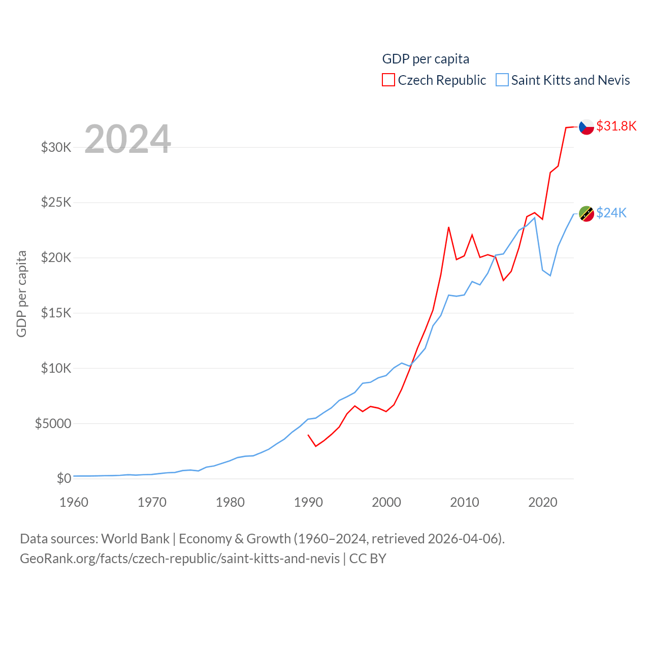 By GDP, The Czech Republic ranks 44/197 ($347B) and Saint Kitts and Nevis ranks 187/197 ($1.12B). By GDP per capita, The Czech Republic ranks 39/197 ($31,823), while Saint Kitts and Nevis ranks 51/197 ($23,961).