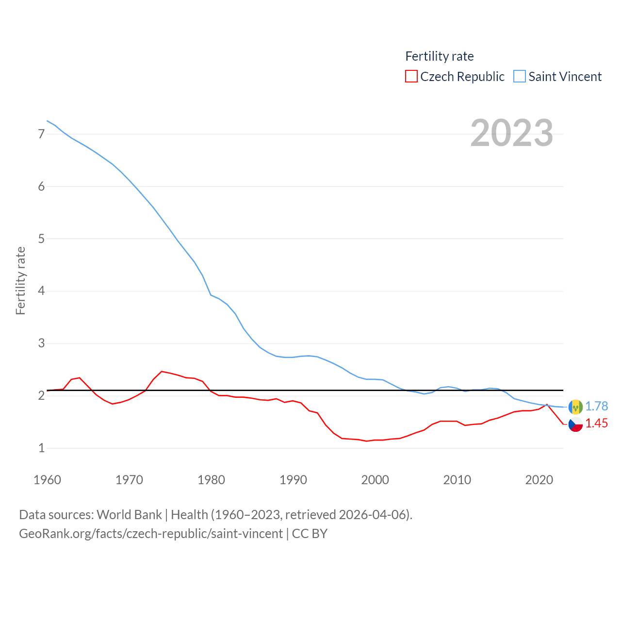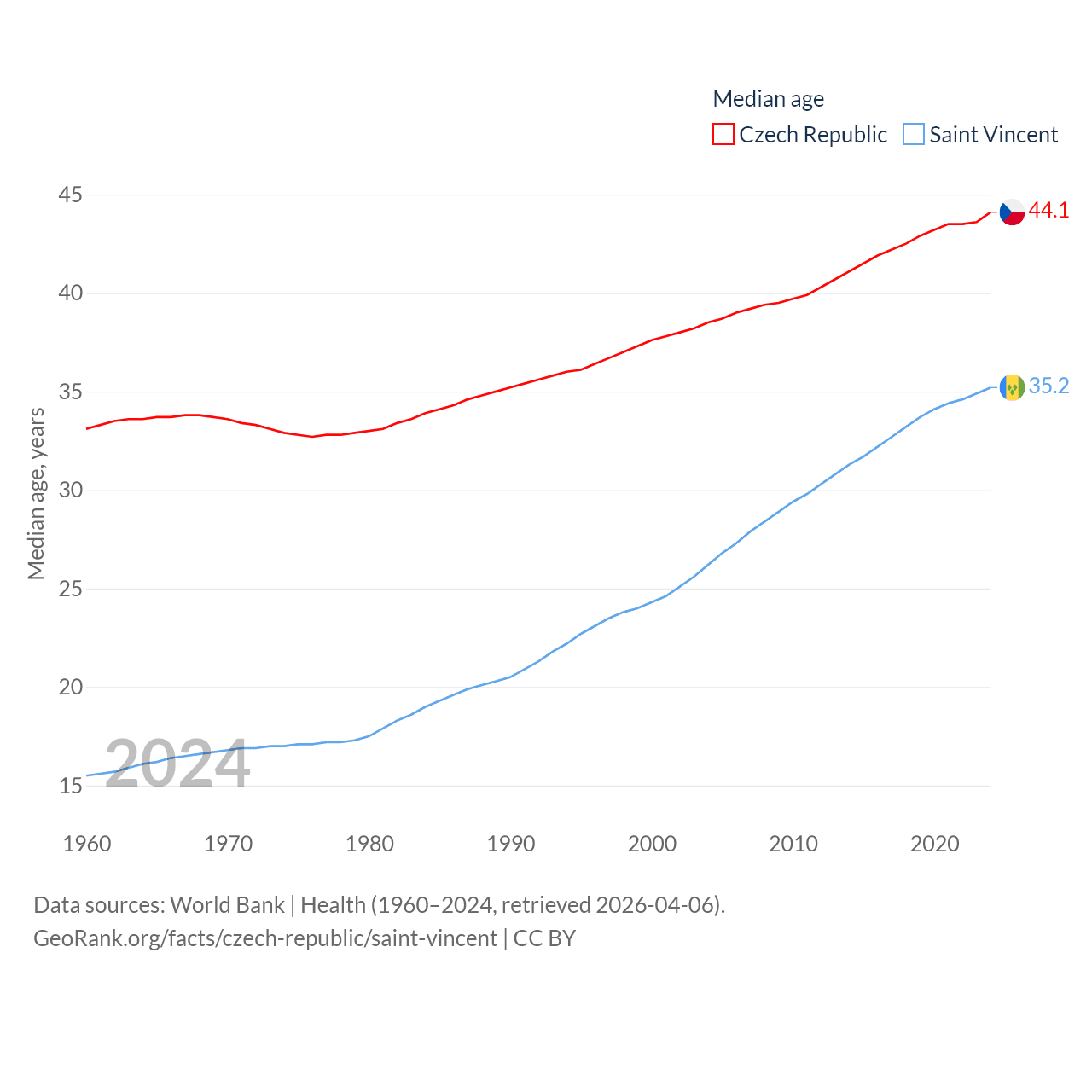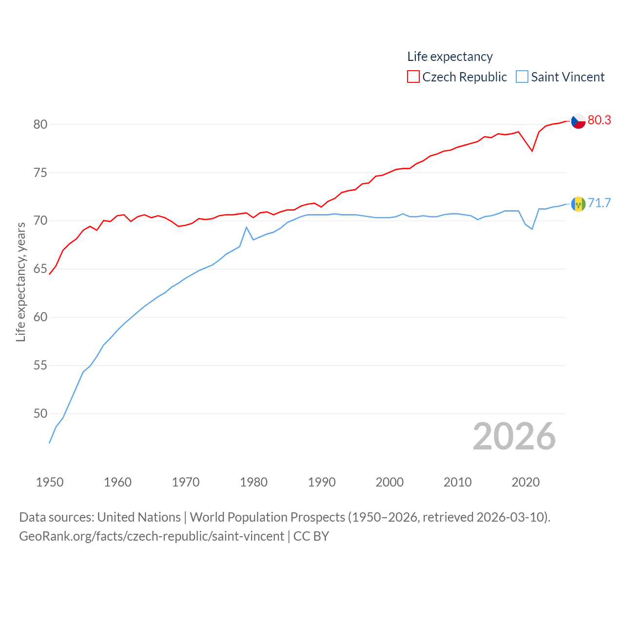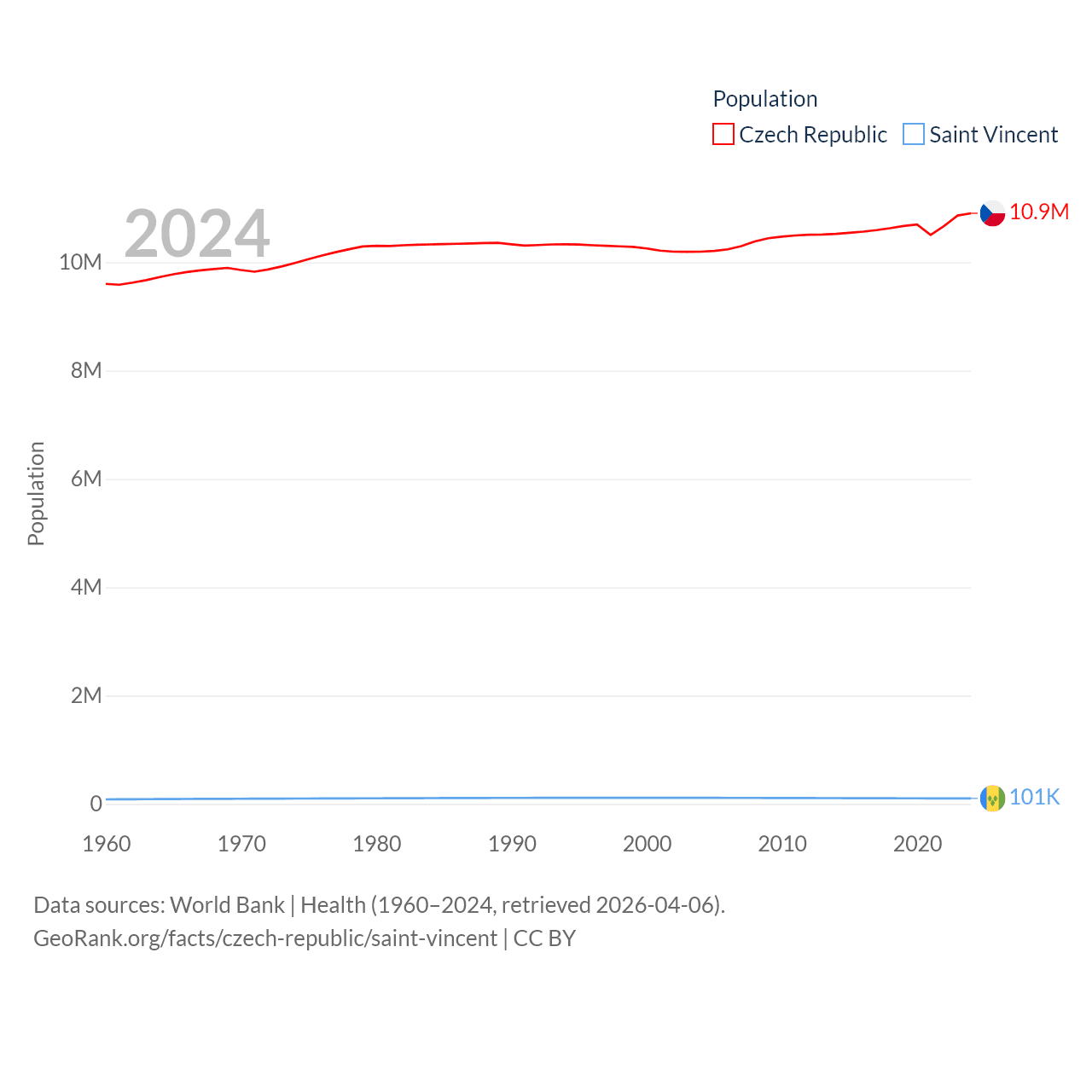 The Czech Republic has a population of 10.9M (ranked 88/197), compared with 101K in Saint Vincent (ranked 184/197). The Czech Republic's land area is 29,794 sq mi versus 150.6 sq mi for Saint Vincent (ranked 114th vs. 185th).